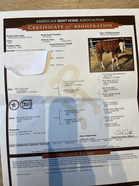Stallone nato nel 2024, figlio di linee di sangue affermate nel cutting, ranch e reining. Pronto per la prossima stagione di esposizioni. Doppio riconoscimento APHA/AQHA. Molto affettuoso e facile da gestire.