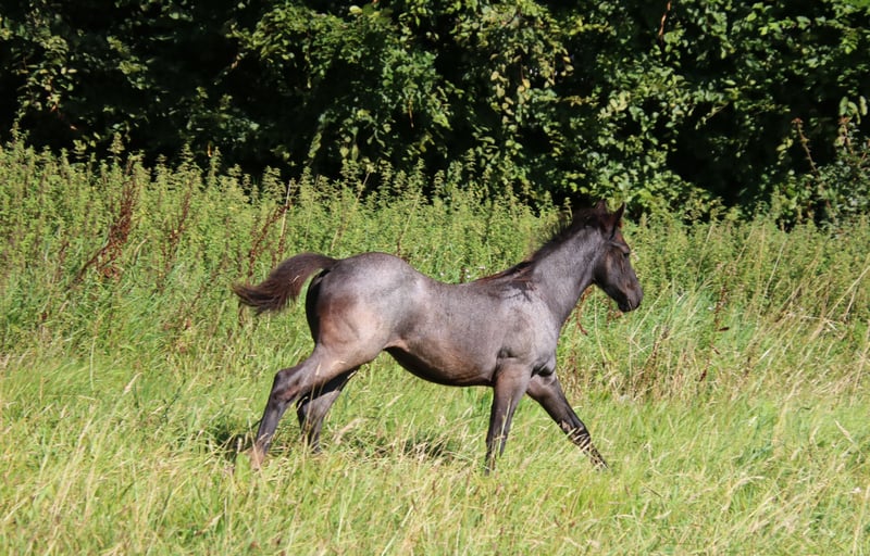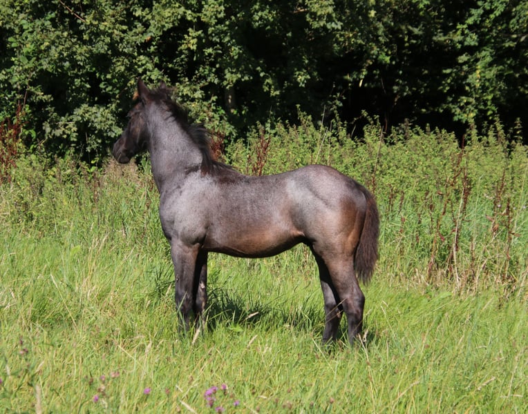 This eye-catching horse in the stunning blue roan color is a must-see in person. Wimpys Dunit Twisten was born in April 2024 and is expected to reach an ideal height of approximately 14.7 to 15.3 hands. Already well-muscled with a great build and an adorable temperament, he impresses from the very first moment. He has a gentle nature, is calm, affectionate, and easy to handle. Curious about the world and very open to new experiences, he is growing up appropriately with peers and is healthy. He has passed a 5-panel genetic test and is IMM n/n through his parents. At the time of sale, he will be familiar with basic foal training, will be dewormed and vaccinated according to age, and comes with AQHA papers and a passport. Wimpys Dunit Twisten is well-suited for sport and competition in the future, but also makes a wonderful leisure partner. His pedigree includes Peppy San Especial, Dun It With A Twist, Wimpys Smoking Gun, and Hancock.