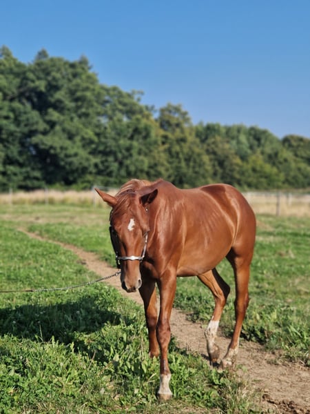 We are also looking for a 5 star home for our "Leo". The cool Quarter Horse stallion (born 2023) saw the light of day with us. His parents are also on our farm: Dam: TL Blue Alice (Aint It The Blues) Sire: Zippos King Bar Leo is a "cool sock" in every respect. He wants to please his owner at all times and is always calm and quiet. He has an athletic, correct conformation and is blessed with an outstanding gait. He is suitable for both competitions and leisure time. He is currently still a stallion and shows no stallion behavior. He is simply a treasure to handle. He has learned everything you need to know at this age: Giving hooves, introducing him to the farrier, grooming, showering/washing, walking/leading. Leo has all his basic vaccinations, is regularly wormed, has a DQHA equine passport and an AQHA certificate of registration. He is currently being bred with other young horses at our stables. He can either stay here for further rearing or move to his new home. If you would like to get to know Leo, just write to us.