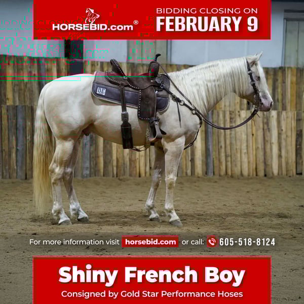 ❤️🔥𝑩𝒆 𝑴𝒊𝒏𝒆 𝐒𝐄𝐋𝐄𝐂𝐓❤️🔥 Happening now thru MONDAY | FEBRUARY 9th - Available EXCLUSIVELY on HorseBid's website! For more details and to register visit: www.Horsebid.com CONSIGNOR CONTACT: Gold Star Performance Hoses 605-518-8124 LOCATION: Brandon SD BREED: AQHA REGISTERED: Yes REGISTERED NAME: Shiny French Boy COLOR: Cremello HEIGHT: 15 AGE: 5 GENDER: Stallion Shiny is one cool dude here he is a beautiful own son of Frenchman's guy, he has the total package pedigree color brains ability and willingness, this young stallion will go far in any direction, take him home and breed some mares or take him in roping pen he has been started on hot heels and really wants to work, and also started on barrels and is so athletic and long strided and learns and picks up things fast, and level headed enough that you can take him down the trails and nothing bothers him, he is the sweetest stud around you would never know he is stud, our kids have climbed all over and under him, he is a absolute dream to be around and ride, he is 5 panel tested NN and with creme gene, his first foal crop will hit the ground spring 2026 and we expect great things, he is one in a million stallion that everyone would enjoy.