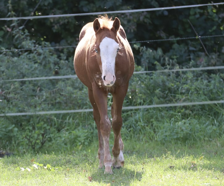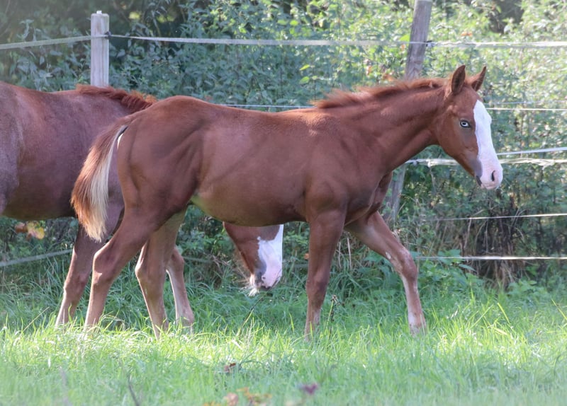 AQHA Hengstfohlen Mai 2025 – Sorrel Splash mit Rabicano/Roan (Test ausstehend) . „Winnie“ hat seit seiner Geburt alle Herzen erobert und sucht nun seinen Lieblingsmenschen. Er liebt alles und jeden, ist für jeden Quatsch zu haben und steht da wie ein kleiner Kraftprotz – kompakt, muskulös und unerschütterlich. . Optisch ist er ein absoluter Blickfang, kräftig, strahlend blaue Augen, korrekt gebaut und mit harmonischem Körperbau. Seine Bemuskelung, der stabile Rücken und die korrekten Gliedmaßen machen ihn zu einem vielversprechenden Nachwuchshengst, sowohl für Zucht als auch für Sport. . Abstammung, die überzeugt: • Vater REDWHITEANDBLUE BOON – Cutting-Elite: Nachkommen von RWABB sind bekannt für ihre Rittigkeit, Leistungsbereitschaft und Qualität auf höchstem Niveau. Seine Nachzucht überzeugt in ganz Europa vollumfänglich. . • Mutterlinie über PALE FACE DUNNIT – Reining-Elite: Diese Linie bringt präzise Wendigkeit, Kraft und einen ruhigen, arbeitswilligen Charakter mit. . „Winnie“ wächst mit gleichaltrigen Kumpels in der Stutenherde auf, ist sozial kompetent, gelassen und lernbereit – und zeigt bereits jetzt viel Will-to-Please. Durch seine Abstammung und seinen Körperbau ist er nicht nur für Züchter interessant, sondern auch sportlich ein angehender Nachwuchsstar. . Geboren im Mai 2025, darf er Ende Oktober/Anfang November in sein neues Zuhause umziehen. Wer bereit ist, sich unsterblich in diesen kleinen Kraftprotz zu verlieben, sollte ihn unbedingt persönlich besichtigen. . Hengstfohlen dieser Qualität und Abstammung werden nur selten verkauft – eine einmalige Gelegenheit. . Für weitere Informationen, Bilder und Videos stehen wir Ihnen gerne zur Verfügung.