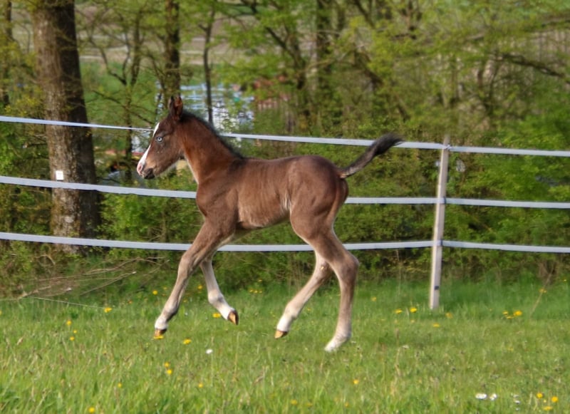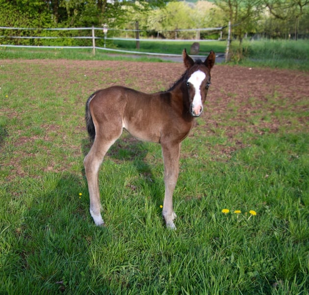 BE My Blue Ice, geboren am 15.04.2026, ist ein bildhübsches Quarter Horse Hengstfohlen in der Farbe Bay mit einem zu erwartenden Endmaß von ca. 147 bis 150 cm. Mit seiner außergewöhnlichen Zeichnung und seinem ausdrucksstarken Erscheinungsbild ist er bereits jetzt ein echter Blickfang. Er überzeugt durch einen korrekten, kompakten und kräftigen Körperbau sowie eine sehr gute Bemuskelung. Seine Bewegungen sind locker, elastisch und von Natur aus sportlich - beste Voraussetzungen für eine spätere Karriere im Reining- oder Allround-Sport. Charakterlich zeigt sich BE My Blue Ice besonders angenehm: freundlich, verschmust, cool und stets unkompliziert im Umgang. Er wächst artgerecht im Herdenverband mit anderen Fohlen auf und wird regelmäßig gehändelt, sodass er bei Abgabe das Fohlen-ABC sicher beherrscht. Seine sehr gute Reining- und Allround-Abstammung (Spooks Gotta Gun x Joe Cougar Hancock) macht ihn sowohl für ambitionierte Turnierreiter als auch für den gehobenen Freizeitbereich hochinteressant. Gesundheit und Aufzucht stehen an erster Stelle - bei Abgabe ist er tierärztlich betreut, dem Hufschmied vorgestellt und regelmäßig entwurmt. Die Abgabe erfolgt selbstverständlich mit AQHA-Papieren und Equidenpass. Ein Youngster mit Qualität, Ausstrahlung und bestem Charakter - ideal als zukünftiges Sport- oder Freizeitpferd mit Perspektive.