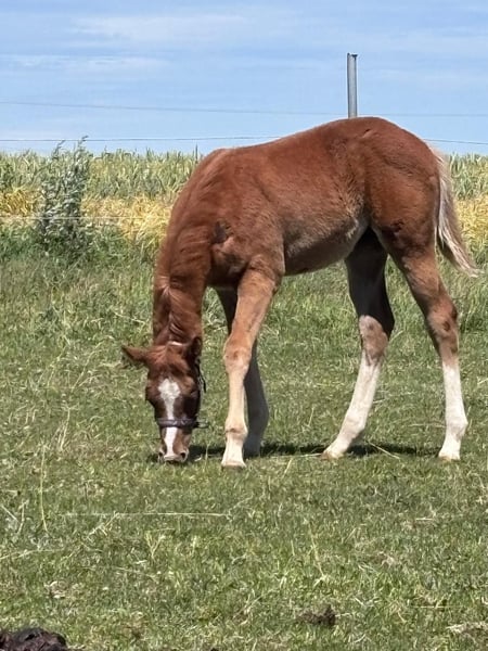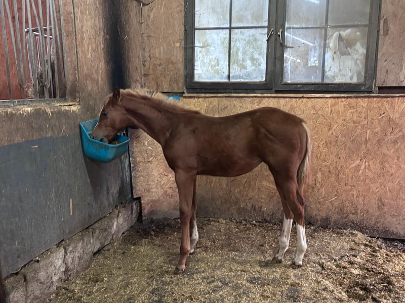 Hot Nite Invitation - ein bildhübscher Quarter Horse Hengst, geboren am 13. März 2025. Mit seiner eleganten sorrel-Farbe, seinem korrekten Gebäude und der harmonischen Bemuskelung ist er ein echter Blickfang. Er wird voraussichtlich ein Endmaß von etwa 160 cm erreichen und damit später auch größere Reiter gut abdecken können. Seine AQHA-Papiere liegen bereits vor. Dieser junge Hengst wächst artgerecht im Herdenverband auf und kennt sowohl Paddock-Box als auch Weide. Er ist altersentsprechend geimpft, regelmäßig entwurmt und an Tierarzt sowie Hufschmied gewöhnt. Hot Nite Invitation zeigt sich stets brav, ruhig und gelassen, dabei aber aufmerksam, lernfreudig und charakterstark. Sein menschenbezogener, lieber Charakter macht den täglichen Umgang mit Rocky zu einer Freude. Auch unter Bewegungsaspekten weiß dieser Youngster zu überzeugen: Er zeigt bereits jetzt schöne, taktreine Grundgangarten und bringt das Potenzial für eine erfolgreiche Laufbahn im Sport oder auf Turnieren mit. Dank seiner erstklassigen Pleasure- und Allround-Abstammung (Hotroddin Invitation x Nite Chip) eignet er sich ebenso hervorragend als zuverlässiger Freizeitpartner. Hot Nite Invitation ist DQHA Futurity startberechtigt, kennt das Fohlen-ABC und ist selbstverständlich halfterführig. Mit seinem hervorragenden Exterieur, seinem angenehmen Wesen und seinem vielseitigen Talent ist er ein echtes Versprechen für die Zukunft - ganz gleich, ob als Showpferd oder treuer Freizeitkamerad.