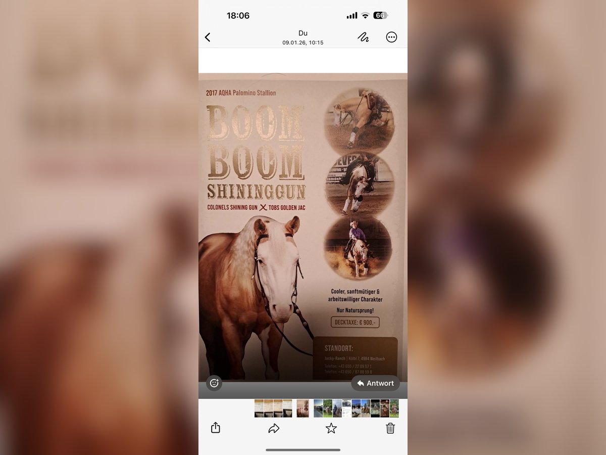 Stunning Palomino American Quarter Horse Hengst zu verkaufen! Dieser beeindruckende Hengst, geboren im Jahr 2017, vereint kraftvolle Leistung mit eleganter Erscheinung. Mit einer Höhe von 142 cm ist er perfekt für Reining und zeigt beeindruckende Beweglichkeit sowie ein ausgeprägtes Talent für die Disziplin. Sein glänzendes Palomino-Fell macht ihn zu einem echten Blickfang im Stall und auf dem Turnierplatz. Er ist gut ausgebildet, zuverlässig und besitzt ein freundliches Wesen, das sowohl erfahrenen Reitern als auch ambitionierten Einsteigern Freude bereitet. Seine Vielseitigkeit und sein Potenzial im Reining machen ihn zu einem wertvollen Partner für alle, die ihre Karriere in diesem Sport vorantreiben möchten. Bei Interesse oder weiteren Fragen stehe ich Ihnen gerne zur Verfügung. Ein persönliches Kennenlernen ist jederzeit möglich!