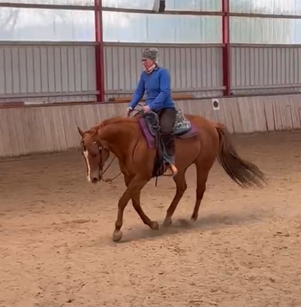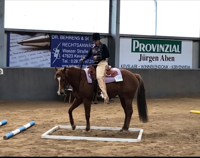 Proud was started under saddle by me at the age of 3.5 and completed her training certification with me at the age of 5. She is trained to LK1-2 level and is familiar with the competition disciplines of Ranch Riding, Ranch Trail, Pleasure, Western Riding, Horsemanship, and Trail. I have only competed with her a few times successfully in LK 3, as competitions are not my thing. I placed great emphasis on a good education. I attended Henning Daude courses with her and participated multiple times in the Horsemanship Camp of the DQHA in Marl at Döring. Additionally, I took a one-day course with cutting legend Paul Derrez, who noted that she shows talent for cutting. I participated in a continuing education program at the Landes Fahr und Reitschule in Langenfeld with her. She loads well onto the trailer and is calm while traveling. She picks up her hooves exemplary; she has taught me a lot during my training as a hoof care specialist. She has always been well ridden and is also familiar with trail riding. I have taken her to the lake as well. She loves free work, where she truly thrives. She is also very child-friendly; I had a 13-year-old riding partner who unfortunately could no longer ride due to a private accident and left us, but the 8-year-old daughter of my cousin has also ridden her freely. Simple vaulting lessons can be performed on her. Proud has a matching saddle, and her equipment has always been checked for fit. She can be ridden in a snaffle, bit, halter, or bosal, with saddle, saddle pad, or without a saddle; she responds well to all aids. With the right rider, she is fearless outdoors. She enjoys working in the arena and on the training ground and is quite motivated there; she is neither lazy nor too fast. She can be initially skeptical of new or unfamiliar situations but is always manageable. She can perform all forms of gymnastic exercises. Shoulder-in and haunches-in at all gaits, traverses at all gaits, flying changes. She stops well on the hindquarters (as well as possible without shoes) and can execute a rollback well. She can perform a hindquarter turn, but this has never been trained to a spin. She is familiar with pole work and riding over tarps or riding with flags. On her papers, she is listed as a sorrel, but she has a dorsal stripe, making her a dun. Her hooves have always been regularly cared for, and the dentist comes regularly as well. Proud is not shod. During my training as an equine physiotherapist, I practiced chiropractic and acupuncture on her, and she has greatly benefited from it. She is also accustomed to dogs around horses; therefore, a Horse and Dog Trail or rides with a dog are also possible with her. Two years ago, she was kicked on her front leg and required stitches. The injury was only superficial and does not limit her in any way. Proud is an all-around professional who is up for any fun! She is a great companion and always wants to please. Due to her good lineage, she would certainly also make a good mother to a successful offspring. Her current training condition is rather lightly trained as I simply lack the time for her, which is also the reason I am selling her. She does not become silly or sassy even if she has not been ridden for a while! Further pictures and videos can be found on the Instagram page CrewUp Westerntraining. https://www.instagram.com/crewup_westerntraining?igsh=Nnpybmp6ZzhwYWZt
