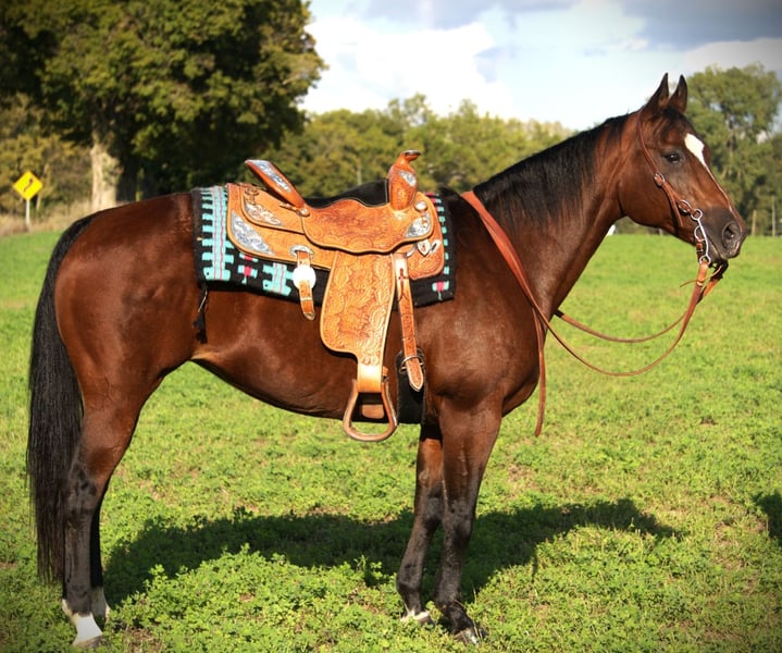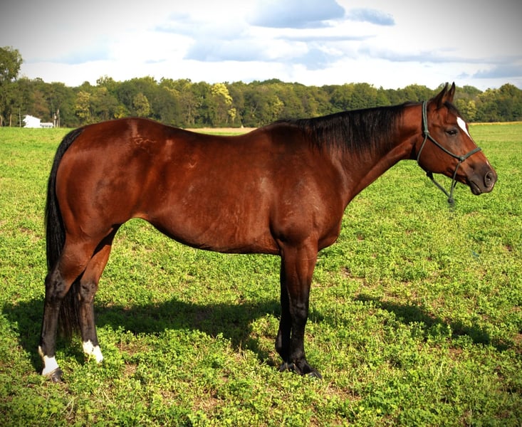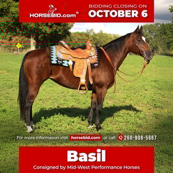 🍂 𝓐𝓾𝓽𝓾𝓶𝓷 𝑨𝑳𝑳 𝑺𝑻𝑨𝑹 𝑳𝑰𝑵𝑬𝑼𝑷 🍂 Happening now thru MONDAY | OCTOBER 6th - Available EXCLUSIVELY on HorseBid's website! For more details and to register visit: www.Horsebid.com CONSIGNOR CONTACT: Mid-West Performance Horses 260-908-5687 LOCATION: Saint Joe, IN BREED: Quarter Horse REGISTERED: No COLOR: Bay HEIGHT: 14.3 AGE: 13 GENDER: Mare Meet the one and only, "Basil"! Basil is a 14.3 hand, Quarter Horse mare, standing a stout and firm 1,200 pounds, with lots of muscle. She checks all the boxes for anyone wanting a good, steady, consistent ranch horse. Basil loves attention, and is always looking for her next friend! She is consistant eveytime you take her out. Whether your going for a trail ride, team penning event, cow sorting in the field, or even take her to a reining event, shes always the same! Basil has been riddin by my 15 year old daughter on trail rides, and she is always the same ole, same ole! She has absolutely no buck, rear, kick, or bite. She does not require any maintenance or shoes. Basil has clean legs and is ready to go! Basil spins very easily with leg pressure. She has a nice slow collected trot and lope, or you can open her up as well and she'll kill it, everytime. She is 100% neck reined and leg pressure trailed. She does phonomal roll backs and will really get underneath herself. She is not spooky and takes to new places perfectly. She has a "stop dead in her tracks" stop. She backs very easily, and is very light mouthed. She is very controllable in any situation you put her in. She jumps right in the trailer, and you never know she's back there while hauling. She does great for the ferrier and to be bathed. Basil is suitable for any age of person from youth rider to adult. She would make a great junior rodeo horse or make any adult a fantastic all around, handy ranch or trail horse! Come check her out! Contact April with any questions. We can arrange shipping anywhere within the USA. Please contact me for more information!