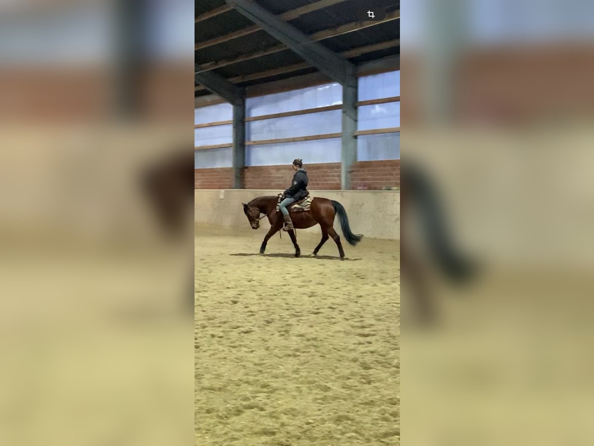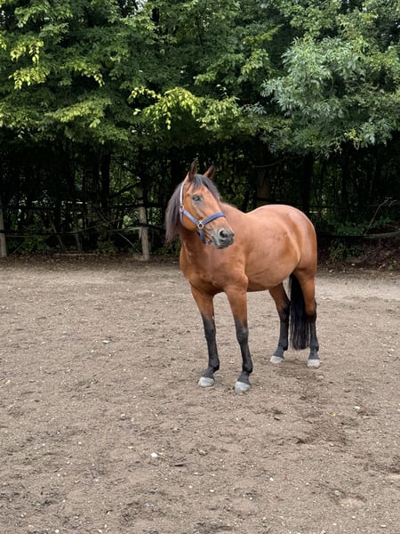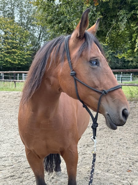 We are selling our Quarter Horse x Andalusian mare, Billy, born in 2011. After a year and a half, we have made the difficult decision to find her a more suitable home, as despite our efforts, the harmony between us has not developed as we had hoped. She is a confident horse with a lot of expression and personality. At the same time, it seems she has had positive experiences in the past – she is particularly sensitive in the stable. She also appears initially cautious around men. However, once she has built trust, she is a very affectionate, attentive horse that genuinely enjoys seeing her handler. Details: - Mare born in May 2011 (13 years old) - Height: 14.1 hh - Color: bay with a small white star - Pedigree: Quarter Horse x Andalusian - Approximately 90% blind in one eye, but this does not affect her performance - Slight saddle resistance Riding: We would say she is not suitable for beginners, as she definitely needs an experienced, calm rider with a gentle hand to ensure both are happy. Her tongue is sensitive/injured, so a soft, fair contact is especially important. She has basic reining training but has mostly been ridden for leisure by us. Due to family reasons, she has recently not been in regular work. Tempo & Terrain: If not properly challenged, she can become quite quick on some days and may even want to race. However, with regular work, she maintains a normal tempo and responds well. In the field, she generally enjoys hacking but is not 100% trail-safe. In certain situations, she may become stressed and restless – therefore, only suitable for riders who can handle such moments confidently. Otherwise, she is quite brave and not easily spooked. Herd Behavior: In the pasture, she is herd-compatible but needs plenty of space. In smaller paddocks, she should ideally be kept alone. She is very dominant but can coexist with geldings in the right setting. --- It is important to us that she finds a loving, experienced home where her sensitivity is understood, and she is given security through calm, clear, and fair handling. We wish for her a new home that may be a better fit – so she can truly find her people and feel at home there.