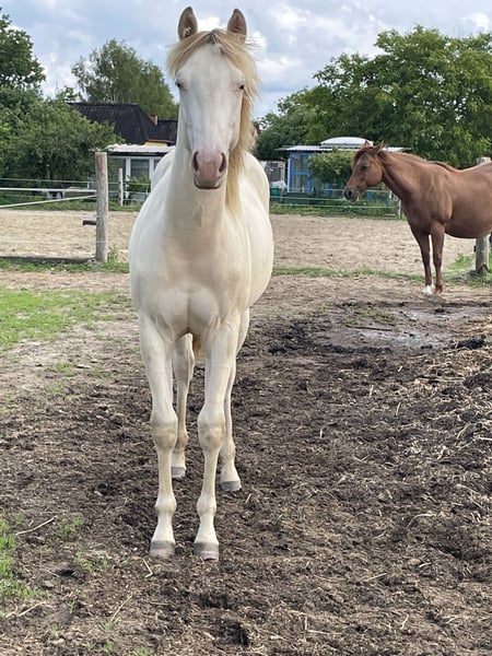 **Verkaufsanzeige: American Quarter Horse Stute** Zum Verkauf steht eine vielversprechende American Quarter Horse Stute, geboren am 07.05. 2024. Diese bezaubernde Champagne-Farbe macht sie zu einem echten Blickfang! **Merkmale:** - Rasse: American Quarter Horse mit Papier vom DQHA sowie AQHA - Geschlecht: Stute - Farbe: Amber Cream Champagne - Stockmaß: 148 cm Endmaß geschätzt - Eignung: Western Allround - Fohlenschau 2024: 1a Prämienfohlen Diese Stute überzeugt nicht nur durch ihre ansprechende Optik, sondern auch durch ihr freundliches, menschenbezogenes Wesen und ihre hohe Lernbereitschaft. Sie ist bestens geeignet für verschiedene Disziplinen im Westernreiten und eignet sich sowohl für Einsteiger als auch für erfahrene Reiter. „Diva“ ist, über ihre Eltern, gendefektfrei! Bei Interesse oder für weitere Informationen stehe ich Ihnen gerne zur Verfügung. Lassen Sie sich diese Chance nicht entgehen und vereinbaren Sie einen Besichtigungstermin!