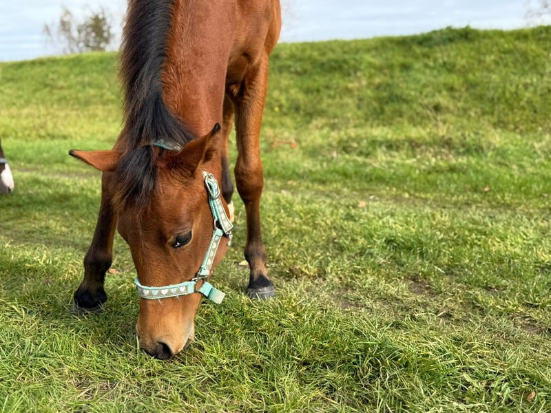 MD Pretty Miss Dunit - eine bildhübsche Quarter Horse/Paint Horse Stute, geboren am 11. März 2025. Sie präsentiert sich in der eleganten Farbe bay (braun) und wird voraussichtlich ein Endmaß von etwa 150 cm erreichen. Margie ist doppelt registriert bei der AQHA und der APHA, ihre Papiere liegen bereits vor. Bei der APHA-Fohlenschau in Könnern wurde sie mit der hervorragenden Wertnote 8,10 als 1a Prämienfohlen ausgezeichnet und belegte in ihrer Klasse den zweiten Platz. Unter insgesamt 18 Fohlen wurde sie zudem als zweitbestes Fohlen der gesamten Schau bewertet - ein Beweis für ihre hohe Qualität und ihr großes Potenzial. Diese junge Stute überzeugt durch ein sehr korrektes Gebäude, eine harmonische Bemuskelung und eine ausgezeichnete Entwicklung. Sie ist rundum gesund, wurde regelmäßig entwurmt, altersentsprechend geimpft und kennt sowohl Tierarzt als auch Hufschmied. Genetisch ist sie bestens abgesichert - sie ist 7-Panel n/n sowie LWO und Splashed White n/n getestet. Besonders auffällig sind ihre partiell blauen Augen, die ihr ein außergewöhnlich schönes und ausdrucksstarkes Erscheinungsbild verleihen. Margie wächst artgerecht im Herdenverband auf und genießt ganztägigen Weidegang. Sie erhält hochwertiges Futter, das optimal auf die Entwicklung von Sehnen, Gelenken und Knochen abgestimmt ist. Im täglichen Umgang zeigt sie sich freundlich, brav und ruhig. Sie ist aufmerksam, menschenbezogen und lernt sehr schnell. Das kleine Fohlen-ABC beherrscht sie bereits sicher, sie ist halfterführig und kennt die grundlegenden Routinen. Auch ihre Abstammung lässt keine Wünsche offen: Margie stammt aus einer erstklassigen Reining-Linie und ist DQHA-Futurity startberechtigt. Sie hat Colonels Smoking Gun/Remenic N Dunit /Arc Sparkle Surprise noch im Papier. Ihre athletischen Grundgangarten und ihre Leistungsbereitschaft lassen schon jetzt erkennen, dass sie sowohl für den Sport als auch für den ambitionierten Freizeitreiter hervorragend geeignet ist. Ob als zukünftiges Showpferd oder als treue Freizeitpartnerin - MD Pretty Miss Dunit vereint ein korrektes Exterieur, sportliches Potenzial und einen Charakter aus Gold. Für diese außergewöhnliche junge Dame wird ein liebevolles 5-Sterne-Zuhause gesucht, gerne mit der Möglichkeit, ihr TalDunnit In The Sandent im Sport weiter zu fördern. Sie ist ab sofort bereit, in ihr neues Zuhause umzuziehen und ihren weiteren Weg mit Menschen zu gehen, die ihre Qualität zu schätzen wissen. NRHA Germany, PHCG Futurity und ins EWU Jungpferdeprogramm einbezahlt.