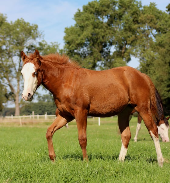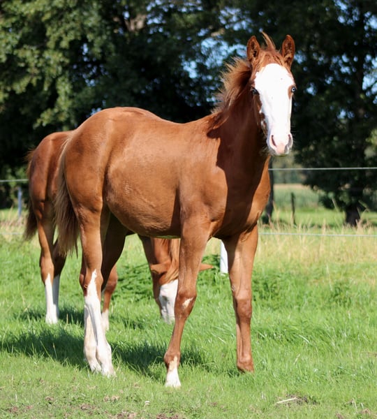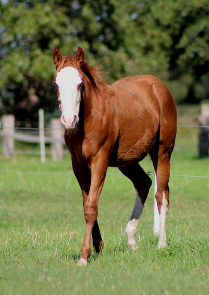 Custom Chrome Line | Modern | Athletic | Performance-Ready We are offering an expressive American Quarter Horse mare, born in 2025, featuring a striking, eye-catching blaze and a large-frame, modern build characteristic of the Custom Chrome lineage. This mare combines size, substance, and athletic elegance – exactly the type in demand in today’s reining sport. She already demonstrates natural talent for reining: good balance, body control, and a pleasant self-carriage. Notably, she shows a high willingness to learn and a calm, people-oriented nature – ideal prerequisites for future training in the sport. Breeding & Papers The mare has been raised in a professional, horse-friendly environment and is well-handled for her age. She possesses: - AQHA Certificate of Registration (COR) - DQHA Equine Passport She has been regularly dewormed and is familiar with the farrier, laying a solid foundation for her further development. Prospect A high-quality reining prospect for ambitious non-pro or open riders, as well as for breeders seeking a large-frame, modern type with performance potential and charisma. ✨ Further upbringing at our facility is possible 📍 Location: Stade, Germany 🌐 www.white-diamond-horses.de