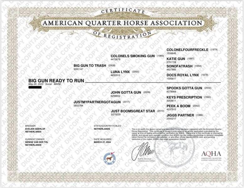 For your consideration Big gun ready to run aka Millie Millie is a 2023, AQHA registered, sorrel mare by Big gun to trash (gunner) out of a John gotta gun (spooks gotta gun) mare. Millie is a super friendly mare who will spend the entire day cuddling if it's up to her. She has basic groundwork training which she picked up very quickly. Millie's bloodline consists of some of the best reining horses and we expect her to excel in that discipline, but she can still go in any direction you want her. Though she'll grow a couple cm, Millie is on the smaller side (139 cm) and will need someone who suits her size. Millie is NOT yet started under saddle Perfect x-rays available, made august 27, 2025 Located in Belgium For more information send me a message with your questions.