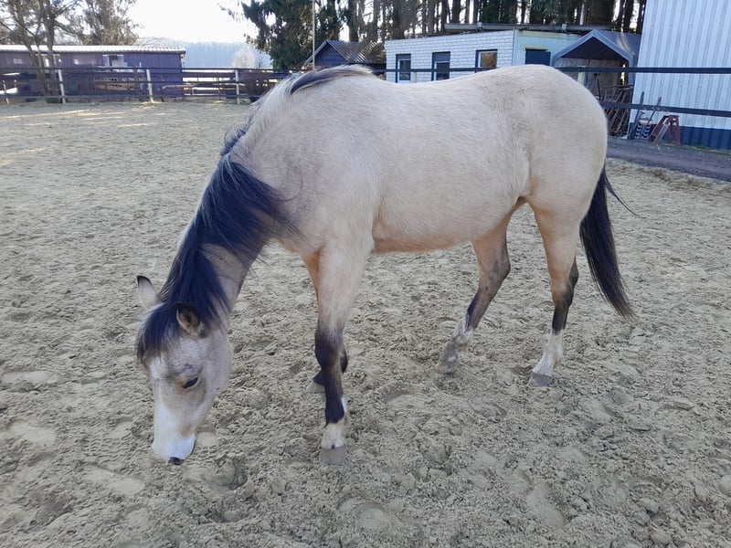 **Verkaufsanzeige: American Quarter Horse Stute – Buckskin, geb. 2024** Zum Verkauf steht eine vielversprechende American Quarter Horse Stute, geboren im Mai 2024. Mit ihrem eleganten Buckskin-Fell und einem geschätztem Endmaß von 148 cm präsentiert sie sich als idealer Partner für Turnier oder Freizeit und ist auch züchterisch interessant. Diese charmante Stute überzeugt durch ihre ausgeglichene Natur und ihre Lernbereitschaft. Sie ist gesund, gechipt, regelmäßig entwurmt, geimpft und frei von bekannten Krankheiten. Papiere hat sie vom AQHA und Pass von DQHA. Leni steht im Offenstall in Herdenhaltung, ist somit Wind, Wetter und andere Pferde gewohnt. Sie kennt den Schmied, läuft aber barhuf, wurde bisher also nur ausgeschnitten. 5 Panel n/n. Ein Pferd mit großem Potenzial für den Turniersport und Zucht oder als zuverlässiger Partner für den Freizeitbereich. Für weitere Informationen und Terminvereinbarungen stehe ich gerne zur Verfügung.