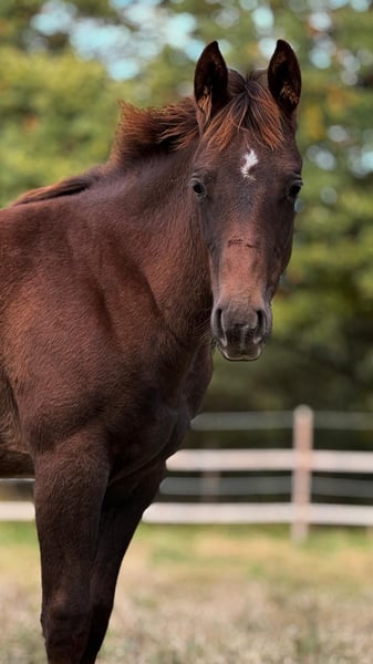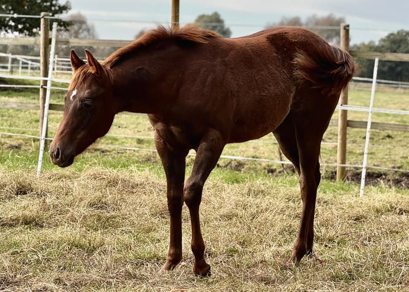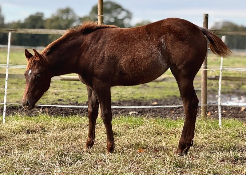 Shez Smart Big Time ist eine ausdrucksstarke Quarter Horse Stute, geboren am 30.04.2024, in der eleganten Farbe Chestnut mit Roan und mit einem zu erwartenden Endmaß von rund 150 cm. Sie besticht durch ihr korrektes, kompaktes Gebäude, harmonische Proportionen und eine großrahmige gesunde Entwicklung. Über die Eltern ist sie 5-Panel n/n und altersgerecht entwurmt sowie geimpft. Aufgewachsen ist sie in einer großen Stutenherde mit viel Bewegung und Sozialkontakt, aktuell steht sie in einer Gruppenbox mit Auslauf und darf unter besten Bedingungen in Ruhe heranwachsen. Charakterlich überzeugt Shez Smart Big Time mit einem liebevollen und menschenbezogenen Wesen. Sie ist eher vorsichtig, dabei aber ruhig, aufmerksam und lernwillig. Im Umgang zeigt sie sich artig, unkompliziert und kooperativ, zugleich verspielt und neugierig. Das Fohlen-1x1 kennt sie bereits, sie ist halfterführig und vertraut auf Hufegeben, Putzen, Hängerfahrten und alltägliche Pflegearbeiten. Auch ihre Abstammung ist bemerkenswert, denn sie gehört zu den ersten Nachkommen des neuen Nachwuchsstars Gunnabebigtime, der in den USA steht. Die Mutter ist eine direkte Tochter vom 8 Mio Dollar Sire Smart Spook. Sie kommt aus einer hervorragenden gezogenen Stutenlinie mit Schwerpunkt Reining und vereint somit Talent, Köpfchen und Ausdruck. Die Stute ist prädestiniert für Sport, Show oder eine vielseitige Freizeitgestaltung und wird ein später vielseitig einsetzbares Nachwuchspferd oder eine gute Zuchtstute aufgrund der interessanten Blutlinie sein - sei es in Reining oder Allround. Die Abgabe erfolgt direkt vom Züchter.