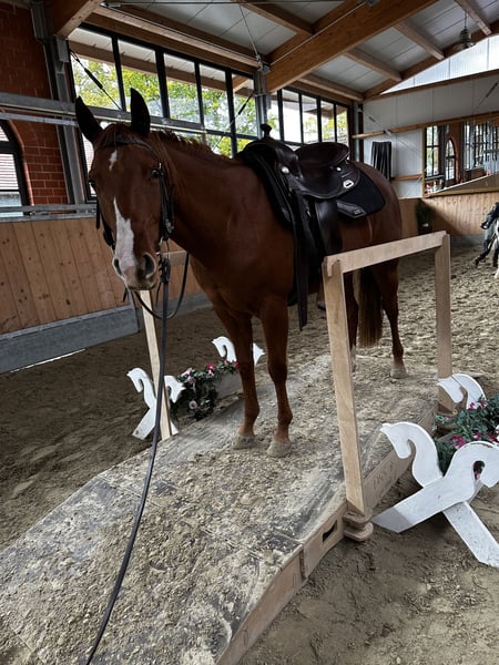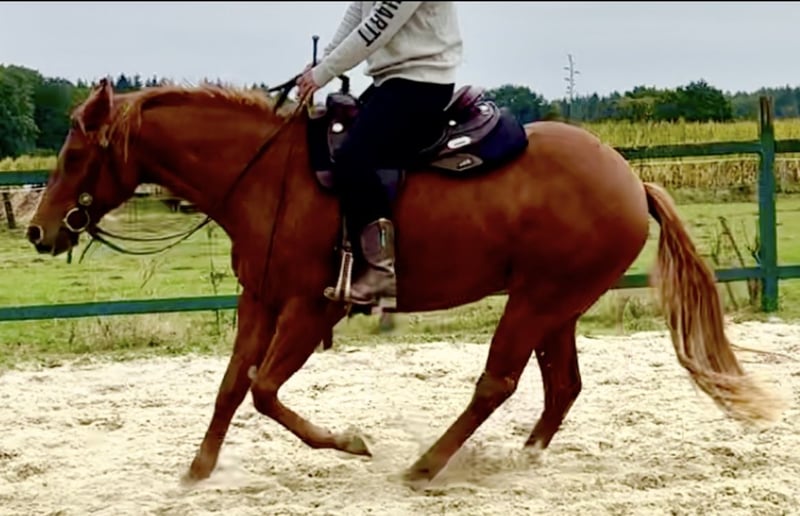 Shiny is a daughter of the DQHA elite stallion CL Scotch Bar Shine, inheriting his excellent athleticism and very expressive, ground-covering movements with a broad stride. Therefore, she is an ideal prospect for all ranch classes. Over the past six months, she has been extensively ground-trained, desensitized, and lunged. From the very beginning, she has been incredibly calm and completely unfazed. She is familiar with training on unfamiliar grounds and loads onto the trailer without any issues. Additionally, she has been ground-driven and used as a lead horse in the field. She has never been ill or lame, has strong hooves, and is barefoot. She lives 24/7 in an open stall with a mixed herd and is easy to socialize with. She ranks low in the herd hierarchy. She is fully vaccinated, regularly dewormed, and has recently had her wolf teeth removed by the veterinarian. Her riding has been started systematically, gently, and step-by-step. She performs all tasks impeccably and has a strong willingness to please. Overall, she is very personable and eager to cooperate. Being a mare is not noticeable in her behavior. Under saddle, she moves politely in all gaits, knows bitless riding, but is also familiar with a water bit. Approximate height: 1.55 m (16.1 hh). Due to her age, she is still relatively unridden and is not suitable for beginners or novice riders.