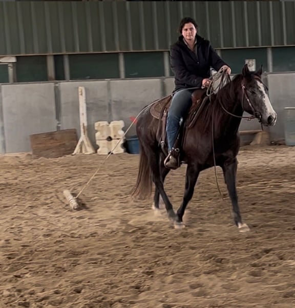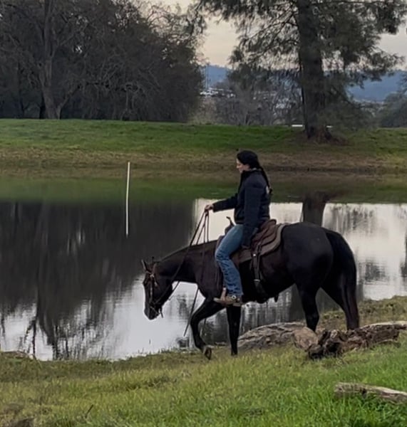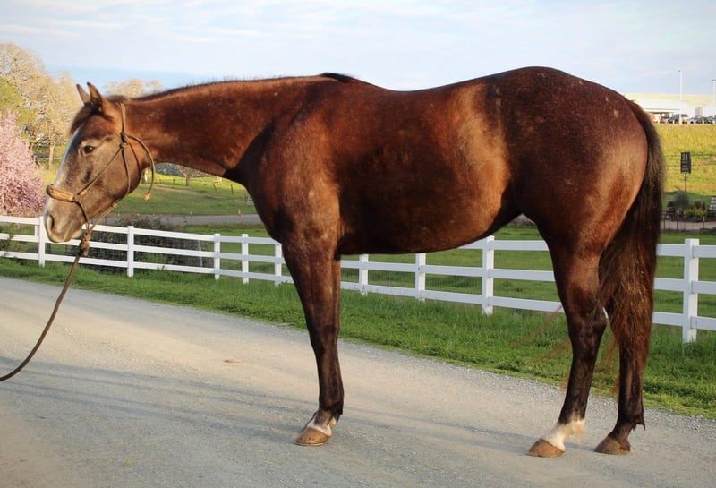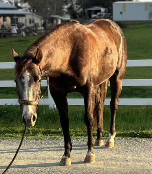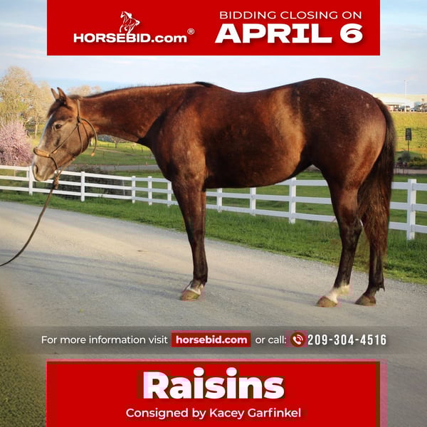 🌟𝑨𝒑𝒓𝒊𝒍 𝐀𝐋𝐋 𝐒𝐓𝐀𝐑 𝐋𝐈𝐍𝐄𝐔𝐏🌟 Happening now thru MONDAY | APRIL 6th - Available EXCLUSIVELY on HorseBid's website! For more details and to register visit: www.Horsebid.comv CONSIGNOR CONTACT: Kacey Garfinkel 209-304-4516 LOCATION: Plymouth, CA BREED: AQHA REGISTERED: Yes REGISTERED NAME: SDP Raise Your Gun COLOR: Grey HEIGHT: 14.2 AGE: 3 GENDER: Mare ✨Fantastic All-Around or Ranch Riding Prospect✨ Raisin is a cute, grey, 3yr old filly. She has a solid start, and is very versatile. She’s a nice mover, has a correct turn around, is confident over trail obstacles, is learning nice transitions, understands your legs and is softening nicely in the bridle. She straight ties, cross ties, is great to bathe, loads and backs out of the trailer, and has no vices. We’ve been gearing her towards the ranch riding and she could easily go show in that this year, but she truly has the ability to go in any direction you’d wish to take her. She’s also started on the flag and has tracked a cow about a dozen times, she is very COWY. She would EXCELL in the ranch versatility, make a bang up sorting horse, or could even go on to make a nice little breakaway horse. We live on 25 acres where she’s been rode outside the arena and exposed to a variety of livestock. She regularly sees sheep, goats, dogs, and the occasional pot belly pig. She has also recently hauled out on her first long trail ride. She rode right off the trailer and was excellent the whole ride. She dropped her nose to the ground and picked her way through the rocks like a pro, very careful with her feet. She has lived inside and outside, is not marish, and gets along well with others in a herd setting. She is not for beginners, and can be a handful some days. She is not an outlaw by any means, just a typical 3yr old that requires someone handy that will keep her in a consistent program and knows how to channel her energy into something productive. She also has a nice set of old school cowhorse papers, making her a nice outcross as a future broodmare. She is sound, UTD, and wears front shoes.