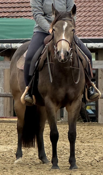 BB SuzyQ, besticht durch ihr hervorragendes Exterieur und ihren menschenbezogenen, liebenswürdigen Charakter. Mit ihrer Sonderfarbe dark buckskin ist sie ein absoluter eye-catcher. Für die Reining Zucht ist sie ein absolutes Juwel. Sie ist schonend Angeritten in allen drei Grundgangarten und wurde als Handpferd mit ins Gelände genommen. Sie bietet sich für den Turniersport in Reining, Ranch Riding und weitern Ranch Klassen an.