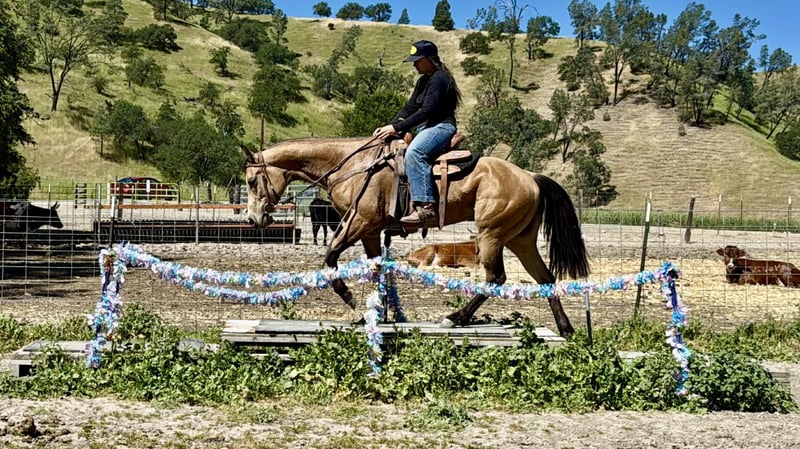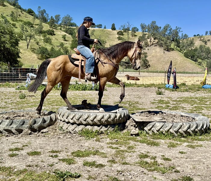 "AVAILABLE ON ONLINE HORSE AUCTION AT www DOT PlatinumEquineAuction DOT com BIDDING OPEN NOW thru SUNDAY | APRIL 19TH! *Final price will be determined on auction site* CONSIGNOR CONTACT INFO: Cheyenne Rey 831-537-8746 LOCATION: Bitterwater, CA Princess is a 4-year-old grade mare standing 14.2 HH. She is a gorgeous buckskin with the kind of mind and talent that is hard to find. Even though she is young, Princess has plenty of experience on the trails, obstacle courses, and has had professional training. She is as quiet and friendly as they come, extremely smart, and quick to learn—show her something once and she remembers it. Princess is very willing to please and always tries her best for her rider. She has never bucked since her first saddling and is easygoing to be around. She handles new situations with confidence and honesty. On the trail, she is quiet and laid-back. She rides well both alone and in a group, crosses water and bridges without hesitation, and travels out at a nice pace. She is familiar with cars, pedestrians, and other common trail sights. In the arena, she has a solid start with good handle. She lopes nicely both directions, has an impressive sliding stop, and spins both ways. She side-passes and can easily open and close gates. She has also been around cattle and has experience moving them from pen to pen. Princess is a great young prospect who would excel in a performance home or be just as happy in a trail or family setting. She is located in Bitterwater, CA. For more information please contact Cheyenne at 831-537-8746.