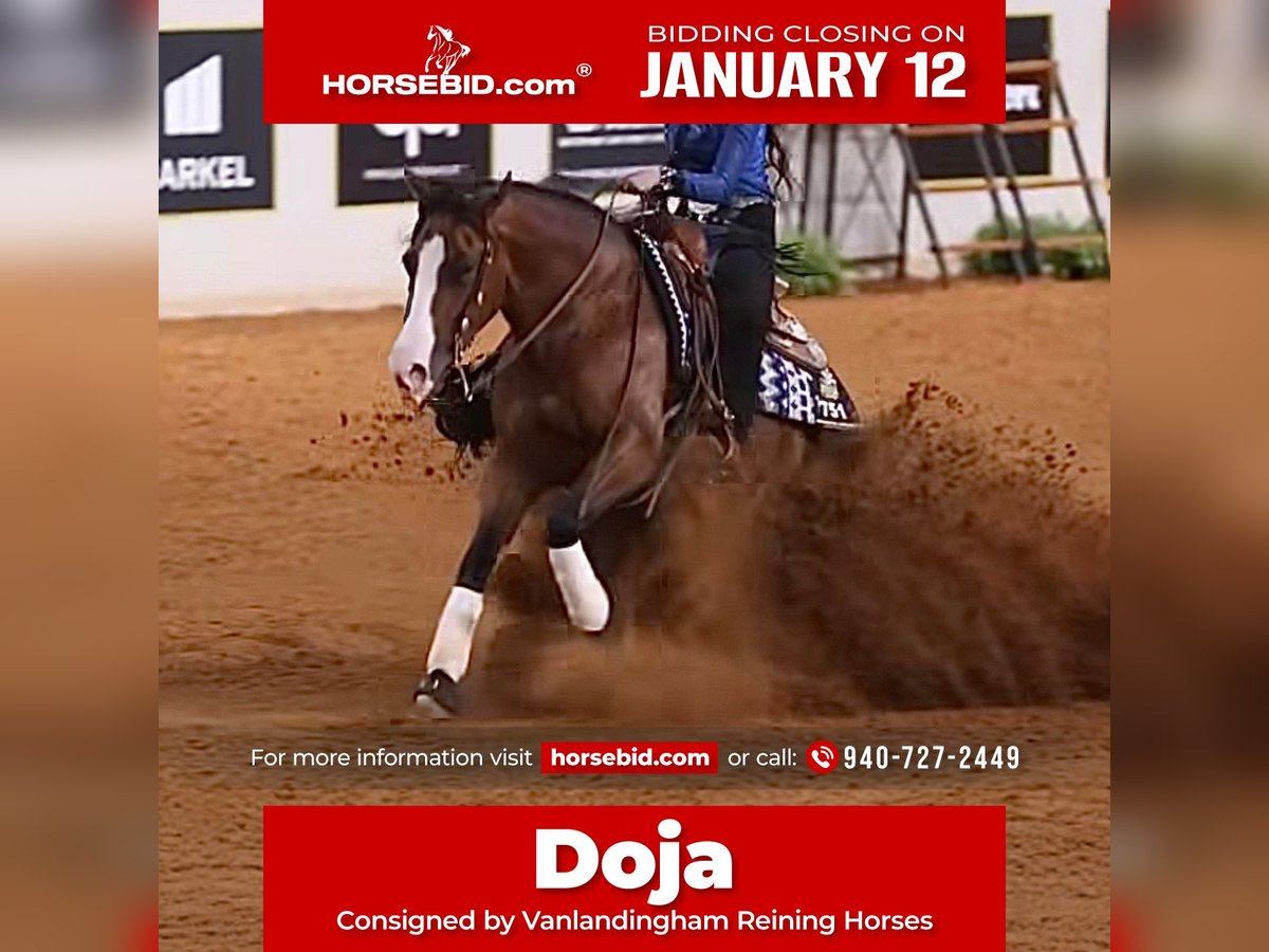 ♦️𝐍𝐄𝐖 𝐘𝐄𝐀𝐑'𝐒 𝑬𝒙𝒕𝒓𝒂𝒗𝒂𝒈𝒂𝒏𝒛𝒂♦️ Happening now thru MONDAY | JANUARY 12th - Available EXCLUSIVELY on HorseBid's website! For more details and to register visit: www.Horsebid.com CONSIGNOR CONTACT: Vanlandingham Reining Horses 940-727-2449 LOCATION: Whitesboro, TX BREED: AQHA & APHA REGISTERED: Yes REGISTERED NAME: Shiney Beat COLOR: Bay HEIGHT: 15 AGE: 4 GENDER: Mare “Doja” This mare has been in our program since she was a yearling and represents our daughter’s very first complete project—prepared start to finish for the NRHA Futurity. Doja proved herself in the show pen by making the Youth Futurity Finals, earning Level 4 money at the Invitational Futurity, and just missing the NRHA Level 4 NonPro Futurity Finals by a mere half point. Following the conclusion of the Futurity the first weekend of December, she was given a well-deserved mental break, as we do with all of our three-year-olds. Doja is now mentally fresh, rested, and ready to return to full-time training. With a little additional finish work, Doja has the ability to put her next owner at the top of major reining events. She possesses all the maneuvers needed to be a big-time Non Pro reining horse or a competitive lower-level Open horse for the derbies. She also has the size, bone, and versatility to excel in multiple disciplines if you choose to go that direction. She is NRHA, NRBC, and NARS enrolled, eligible for the 100X program,. Doja is also double registered with AQHA and APHA, making her eligible for all Chrome Cash Incentives. The majority of Doja’s riding to date has been in the arena, though she has also spent some time riding outside at the ranch and handled the great outdoors with confidence. She has been hauled extensively to all of the NRHA’s major events, giving her plenty of miles and exposure to a wide variety of facilities and environments. We do want to make note that Doja does have a superficial crack on both hind hooves. She does not require special shoeing and is barefoot up front. She has been evaluated by multiple veterinarians, has not required any treatment, and has no soundness issues. As a yearling, she x-rayed clean. Pre-purchase veterinary exams are welcome. Beyond the show pen, Doja checks every box as a future broodmare—big, strong, conformationally correct, and extremely athletic. She is also a standout visually: a gorgeous dark bay with a bold blaze, blue eyes, and stocking legs. Very flashy and eye-catching. Doja is by the great Colonels Shining Gun, a five-million-dollar sire, and out of a proven mare who was shown extensively with an exceptional winning record (NRHA money won 41 of the 46 times shown ). After purchase, we welcome your trainer to come ride Doja for the day so we can share insight and guidance on how to help her function to the best of her ability. A special, well-started, well-traveled, and thoughtfully managed young mare with a proven foundation, strong pedigree, and tremendous long-term value.