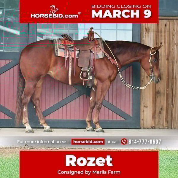 ℳ𝒶𝓇𝒸𝒽 ♦️𝐑𝐈𝐃𝐄𝐑'𝐒 𝐂𝐇𝐎𝐈𝐂𝐄♦️ Happening now thru MONDAY | MARCH 9th - Available EXCLUSIVELY on HorseBid's website! For more details and to register visit: www.Horsebid.com CONSIGNOR CONTACT: Marlis Farm 814 777 0607 LOCATION: Rebersburg, PA BREED: Quarter horse REGISTERED: Yes REGISTERED NAME: NF Slippers With Wings COLOR: Sorrel HEIGHT: 15 AGE: 4 GENDER: Mare NF Slippers With Wings AKA Rozet is a beautiful registered AQHA mare standing right at 15 hands tall. She has had reining training and has already won money in the ranch riding futurity. She is soft in the bridle, responsive to her cues and shows great promise to continue on or take her any direction you choose. She has a great turnaround and follows it with a big stop! Not only is Rozet very talented but she is also safe and gentle enough for the whole family to ride and enjoy. She has a kind and willing disposition and a steady mind making her safe and suitable for all level of riders. She is the type of mare you can ride in the arena and look like a professional or take her out on the trails and feel confident every step of the way. Rozet is the type of mare i put my little boys on to ride in the arena and i can walk away and feel confident she will take care of them. She stands to be mounted, tacked and to be washed and stands for the farrier. She loads and unloads well. She does well in a stall or turned out in a mixed herd. Rozet is the perfect combination of athletic ability and family friendly tempermant. She sells safe, sane and sound and ready to be your forever partner. For more info or to come meet her, call Mark 814 777 0607 (call only) We can help arrange shipping anywhere!