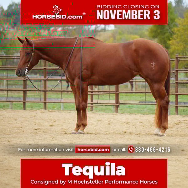 ⚜️𝐓𝐇𝐄 𝐅𝐀𝐋𝐋 𝐇𝐄𝐑𝐈𝐓𝐀𝐆𝐄 𝐂𝐋𝐀𝐒𝐒𝐈𝐂⚜️ Happening now thru MONDAY | NOVEMBER 3rd - Available EXCLUSIVELY on HorseBid's website! For more details and to register visit: www.Horsebid.com CONSIGNOR CONTACT: M Hochstetler Performance Horses 330-466-4216 LOCATION: Fredericksburg, OH BREED: AQHA REGISTERED: Yes REGISTERED NAME: NF Slipperswithwings COLOR: Sorrel HEIGHT: 15.1 AGE: 3 GENDER: Mare Tequila is a registered 3-year-old quarter horse mare with exceptional confirmation athletic ability and looks. She is up-to-date on vaccines. , stands well for the farrier and hauls well . She was shown in September in the Buckeye Rach Futurity . Where she plays the third in ranch trail riding in her first show. She was also shown in a halter confirmation class where she placed third. She has been in training with M. Hostetler Performance Horses. She has a great start in all the reigning maneuvers, Changes leads with ease and is very trainable .She has been trail ridden, and been to the brandings . She would make an exceptional ranch riding horse . Or all around ranch horse . Show her now, and breed her later . Locate it in Fredericksburg, Ohio. For more information, contact Michael Hostetler@ 330-466-4216
