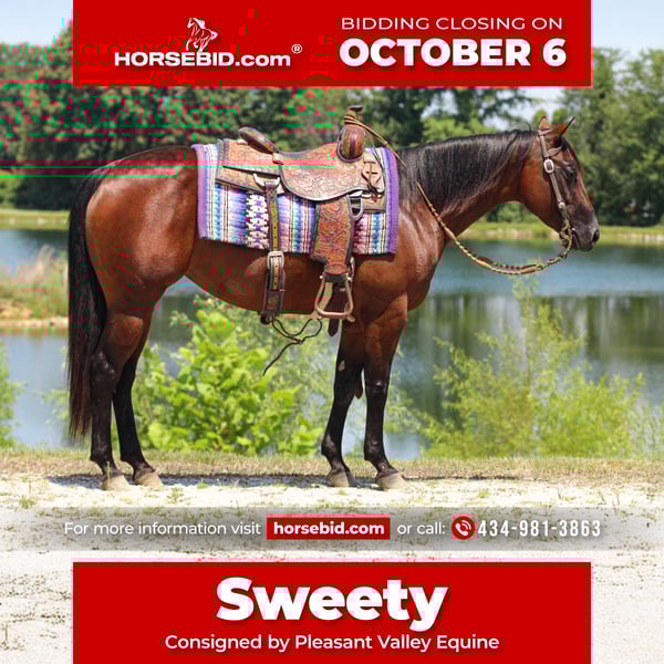 🍂 𝓐𝓾𝓽𝓾𝓶𝓷 𝑨𝑳𝑳 𝑺𝑻𝑨𝑹 𝑳𝑰𝑵𝑬𝑼𝑷 🍂 Happening now thru MONDAY | OCTOBER 6th - Available EXCLUSIVELY on HorseBid's website! For more details and to register visit: www.Horsebid.com CONSIGNOR CONTACT: Pleasant Valley Equine 434-981-3863 LOCATION: Robards KY BREED: Quarter Horse REGISTERED: Yes REGISTERED NAME: Gee Whiz She Scoots COLOR: Bay HEIGHT: 14.2 AGE: 5 GENDER: Mare Checkout the bloodlines on this beautiful bay mare. She fancy bred with Topsail Whiz & Shining Spark on her papers. Sweety has all the looks, brains and athletic ability to go in any direction you want too; go show or just have a beautiful partner to hit the trails with. She stands 14.2 hands and as cute as they come. She has a great disposition, easy going more whoa then go and fun to ride and no bad habits. She has the cutest expression and has little bitty mouse ears. Saddle her up and you have a wonderful partner you can take in any direction. She walks, trots, and lopes circles in the arena. Sweety has the smoothest, little jog & a rocking chair lope. Lay the bridle reins across her neck and he’ll wrap into a nice little turnaround. She will also strike out on trail crossing logs, roads, ditches, etc. Sweety been hauled on trail rides with 100+ riders. She stands quiet to the trailer, bathing, mounting, dismounting and for the farrier. She loads in and out of the trailer and hauls great. She's 100%sound and UTD on vaccinations and coggins.
