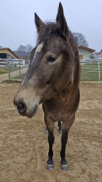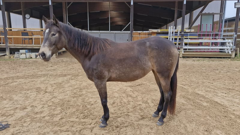 Miss Sinny Bar – a buckskin-colored Quarter Horse mare born in June 2021, approximately 15 hands (150 cm). She is elegantly built, athletic, and not a heavy horse, but impresses with her harmonious development and natural athleticism. Despite a previously fractured spinous process at age two, which her veterinarian confirms has fully healed, she is now healthy, fully sound, and regularly ridden. The veterinarian can be consulted for details. She is 5-panel negative (n/n) through her lineage, regularly vaccinated, dewormed, and dental checked. She is barefoot and has always been professionally saddle-fitted. Currently, she lives in an open stable with 24-hour hay supply and turnout, where she is dominant within the herd. In handling, she is a very affectionate, people-oriented, and cuddly horse, yet also confident, curious, and sometimes a bit impatient. She always wants to please, learns quickly, and shows great eagerness and openness to new tasks. As she still questions her environment and requires clear, fair leadership, she is not suitable for beginners. Miss Sinny Bar has been gently and versatile trained according to the Pro-Ride concept. She rides confidently in walk, trot, and canter in the arena and reliably goes out alone or in a group, both on the trail and in the field. She demonstrates particular talent in liberty work, ground work, and lunging. Thanks to her excellent reining pedigree (Einsteins Revolution x Bueno Swiss Doc), she is not only an attractive prospect for ambitious leisure riders but also has potential for breeding. A suitable saddle can be purchased with her upon request. As this is not a distressed sale, great importance is placed on finding a suitable home where this talented mare can continue to develop and be kept engaged in varied activities. Miss Sinny Bar has everything one could wish for in a young, motivated horse eager to grow together with her human partner.