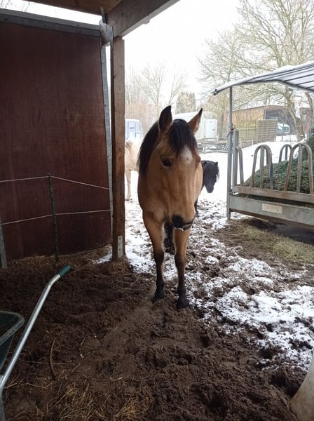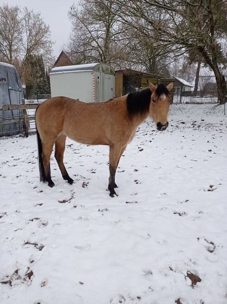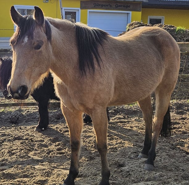 Leider muss ich mich aus verschiedenen Gründen von "Rose" trennen, die schon als Absetzer zu uns kam. Sie ist jetzt in dem Alter, wo sie gern mehr tun möchte, aber das kann ich ihr aus Fehlender Zeit und ohne passenden Reiter, nicht geben. Seit Jahren wurde mit Rose in Zusammenarbeit mit einem Trainer, viel Bodenarbeit gemacht, allerdings mit vielen Unterbrechungen, Zeit.- Wetterbedingt und weil sie ein sehr spät reifes Pferdchen ist. Sattel und Trense kennt sie aber schon länger und mit dem Anhängertraining, wird wieder begonnen, sobald die Bodenverhältnisse es zulassen. Ich trenne mich wirklich schweren Herzens von Rose, aber nicht nur die schon genannten Gründe veranlassen mich dazu, sondern vor allen Dingen, weil ich merke, dass sie sich hier einfach nicht mehr so richtig wohl fühlt. Die Stallsituation (woran ich leider nichts ändern kann) hat sich vor einiger Zeit so verändert, dass sie jetzt die Führungsposition einnehmen müßte. Damit ist Rose aber total überfordert und unglücklich. Sie lebt bei uns im Offenstall und im sommer auf der Weide, kennt aber auch die Box. Autos, LKWs, Landmaschinen, Fahrräder, Hunde und spielende Kinder etc. sind ihr nicht fremd und machen ihr auch nichts aus. Fremden gegenüber ist sie zuerst etwas skeptisch, was sich aber legt, wenn man sich mit ihr beschäftigt, denn sie hat sehr viel Vertrauen in dem Menschen. Rose war noch nie krank, daher habe ich im Frühjahr 2025, mal die üblichen Röntgenbilder machen lassen, um mir da auch sicher zu sein und die sind wie erwartet natürlich "ohne Befund". Deshalb und auch wegen ihrer guten Abstammung, wäre sie sicherlich auch für die Zucht interessant (5 Panel N/N über die Eltern). Mir ist es sehr wichtig, dass Rose ein gutes zu Hause bekommt, daher gilt Platz vor Preis.