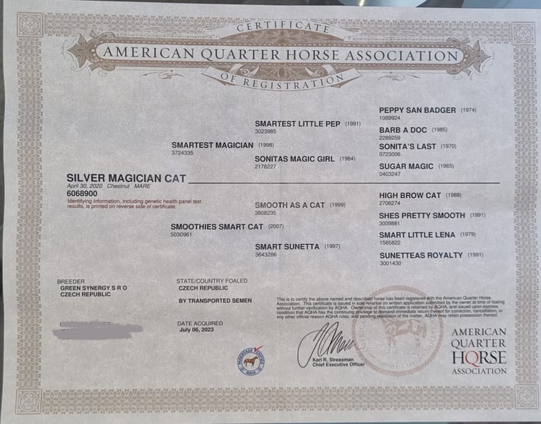 Dream Mare with Top Pedigree Seeks Her Forever Home! For sale is Silver Magician Cat, a stunning 5-year-old Quarter Horse mare (Chestnut, 2020) with excellent bloodlines and promising talent. Details: • Breed: American Quarter Horse • Color: Chestnut • Gender: Mare • Date of Birth: April 30, 2020 • Price: currently €15,000 negotiable (price may vary depending on training progress) • Pedigree: Smartest Magician x Smoothies Smart Cat (featuring high-caliber ancestors such as High Brow Cat, Smart Little Lena, and Peppy San Badger) Special Features & Talent: Silver Magician Cat impresses with her fantastic movement, expressive presence, and commanding demeanor. She already shows potential not only as a riding horse but also as a breeding prospect – her pedigree speaks for itself! She is currently in basic training and has gained experience with cattle. She is eager to learn, motivated, and ready to be further developed. Who is she suitable for? As she is highly talented, she needs an experienced rider who enjoys developing her potential. With her movement talent and pedigree, she is ideally suited for the cattle sport (Cutting, Cowhorse, Ranch Riding) but also highly interesting for ambitious riders from other disciplines. Future prospects: Thanks to her top pedigree, she will also be very appealing for breeding in the future. An investment that pays off twice – in sport and in breeding. • Large pre-purchase veterinary exam from August 17, 2023, with no findings; X-rays available • Regular dental care, physiotherapy, deworming, and mineral supplementation • Well-groomed and lovingly cared for Extras: • Complete, suitable equipment can be purchased separately if desired • Sale due to health-related retirement from competitive riding Viewing & trial riding possible! Silver Magician Cat can be visited and tried under saddle by appointment at any time. If you are looking for a mare with character, quality, and great potential, Silver Magician Cat is exactly the right choice!