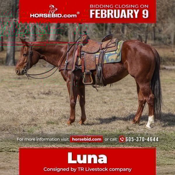 ❤️🔥𝑩𝒆 𝑴𝒊𝒏𝒆 𝐒𝐄𝐋𝐄𝐂𝐓❤️🔥 Happening now thru MONDAY | FEBRUARY 9th - Available EXCLUSIVELY on HorseBid's website! For more details and to register visit: www.Horsebid.com CONSIGNOR CONTACT: TR Livestock company 605-370-4644 LOCATION: Rusk, TX BREED: AQHA REGISTERED: Yes REGISTERED NAME: Meradas lunareclipse COLOR: Sorrel HEIGHT: 14.2 AGE: 8 GENDER: Mare MERADAS LUNARECLIPSE AKA Luna is a 8 year old sorrel mare, standing 14.2 hands tall. Luna is a finished cutter and has a lot of cow sense and will really watch a cow! She’s an all-around, dependable mare that has seen just about everything you can throw at a horse. She’s sired by Thomas E Hughes (NCHA earner of $393,044.80) She is out of Meradas kitten (NCHA earner of $73,036.07) Luna has extensive training in and out of the arena, She lopes nice circles, knows her leads, has a big stop, nice turnarounds, and a nice, soft feel in the bridle. She has tracked the hot heels on the heel side and has the mind and ability to make a very competitive sorting or penning horse. She has a natural cow sense, reads cattle well, and stays with them without getting hot or pushy. Outside on the ranch, she’s been a true working horse, gathering cattle, and branding calves. She crosses water without hesitation, steps confidently over bridges, ditches, logs, and rough ground, and goes wherever you point her. She’s gentle enough for the family, friendly, and easy to be around. She is great to haul, load, bathe, and stands tied all day without fuss.Luna is an excellent mare with the mind, ability and pedigree to do anything! Luna is located in Rusk Texas, nationwide shipping is available! Call or text Rachel 605-370-4644 for more info!