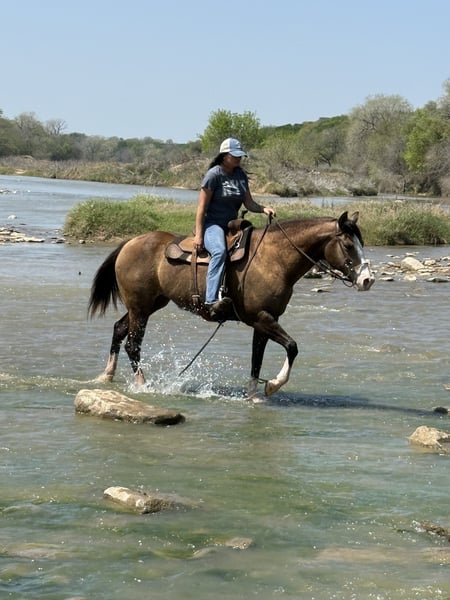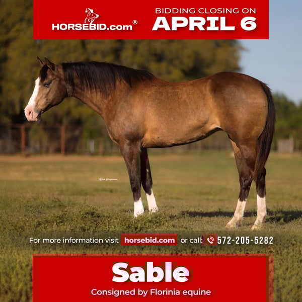 🌟𝑨𝒑𝒓𝒊𝒍 𝐀𝐋𝐋 𝐒𝐓𝐀𝐑 𝐋𝐈𝐍𝐄𝐔𝐏🌟 Happening now thru MONDAY | APRIL 6th - Available EXCLUSIVELY on HorseBid's website! For more details and to register visit: www.Horsebid.com CONSIGNOR CONTACT: Florinia equine 572-205-5282 LOCATION: Edmond, OK BREED: Aqha REGISTERED: No COLOR: Buckskin HEIGHT: 15.2 AGE: 8 GENDER: Mare ble is an 8-year-old buckskin mare standing 15.2 hands tall, and she is the kind that checks all the boxes for a family looking for safety, quality, and eye appeal. With her bold blaze face, one blue eye, and flashy buckskin color, she is an absolute standout anywhere she goes. Sable is very gentle and has the kind of mind that makes her fit a wide range of riders. She is big enough for the husband to enjoy and safe enough for the children to feel confident on. She is the kind of mare that is simply handy to have around, whether you want to enjoy a quiet trail ride, take her to town, or have a dependable horse for the whole family to use. She is soft in the bridle, one-hand broke, and has a smooth, easy way of going. Sable will lope nice circles and rides around with a willing, user-friendly feel. Out on the trail, she is exactly what everyone wants — an amazing trail horse that will go through and over anything you point her at. She is confident, steady, and dependable in all kinds of country. Sable has also been ridden in grand entries and parades, giving her valuable outside experience and showing the kind of mind she has in busy atmospheres. She has been started on the head side and in breakaway, making her a fun option for someone wanting a versatile mare with more than just trail experience. She does have a scar on her front left leg, but it is purely superficial and causes her zero discomfort. It is only cosmetic and does not affect her in any way. If you are looking for a safe, gentle, flashy, below-budget mare that the entire family can enjoy, Sable is a hard one to beat. She is the kind that is attractive, broke, versatile, and dependable — all wrapped up in one beautiful package.
