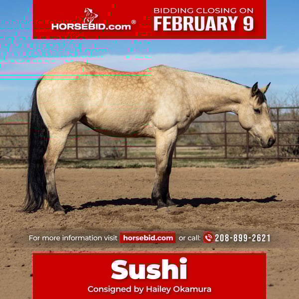 ❤️🔥𝑩𝒆 𝑴𝒊𝒏𝒆 𝐒𝐄𝐋𝐄𝐂𝐓❤️🔥 Happening now thru MONDAY | FEBRUARY 9th - Available EXCLUSIVELY on HorseBid's website! For more details and to register visit: www.Horsebid.com CONSIGNOR CONTACT: Hailey Okamura 208-899-2621 LOCATION: Wickenburg, AZ BREED: American quarter horse REGISTERED: Yes REGISTERED NAME: Sushi Addiction COLOR: Buckskin HEIGHT: 15 AGE: 9 GENDER: Mare Sushi is a 15 hand 9 year old registered mare that has been on our ranch her entire life. She is a finished head horse that will fit intermediate and experienced ropers. She lopes correct circles. This mare is sound at a walk trot and lope in both directions. The scar on her neck and left hind leg are from an accident as a colt that cause her zero lameness issues now. We have started her on the breakaway. Sushi is easy to saddle, bath, blanket and shoe. With any further questions please contact me at (208) 899-2621.