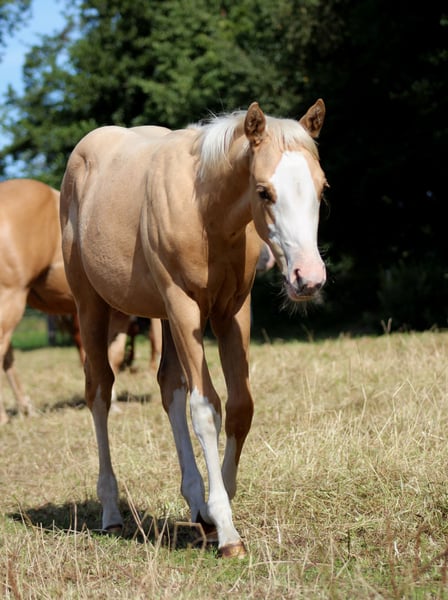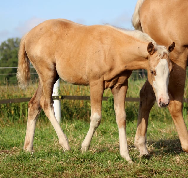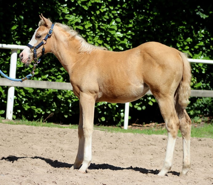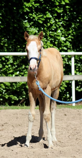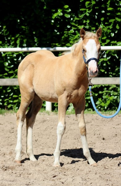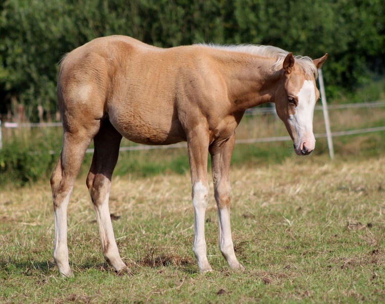 **For Sale: American Quarter Horse Mare** AQHA mare palomino splash born: 04/10/2025 PSSM N/N, GBED N/N, HERDA N/N, MH N/N, HYPP N/N, IMM N/N NRHA Germany SSP (paid up) Sire is TINKER WITH GUNS. He is a million-dollar sire ($1,254,000) and his lifetime earnings amount to $346,366. He was, among other achievements: 2012 NRHA Open Derby Co-Reserve Champion 2012 NRBC Open Derby Reserve Champion 2012 Cactus Reining Classic Open Derby Champion 2011 NRHA Open Derby Champion 2011 NRHA Futurity Shootout Champion 2011 NRBC Open Derby - 3rd Place 2011 NRBC Open Derby Prelim Champion 2011 Reining By The Bay Open Derby Champion 2011 Cactus Reining Classic Open Derby Champion 2011 NRHA #3 Open Reining Horse 2009 NRHA Open Futurity - 4th Place 2009 Scottsdale Classic Open Futurity Champion The dam of TINKER WITH ROSES is YELLOROSEOFTEXAS by GALLO DEL CIELO. GALLO DEL CIELO is an NRHA $4 Million Sire and NCHA Million Dollar Sire. His lifetime earnings are $28,437. His successes include NCHA Open Derby Finalist, Chisholm Trail Open Derby Finalist, Abilene Western Open Derby Finalist, and NRHA's #5 All-Time Leading Sire, Sire of Cutting, Reining, Reined Cow Horse Champions. Gallo Del Cielo is a full brother to Grays Starlight! For sale is a promising American Quarter Horse mare, born in 2025. With her striking palomino coat, broad white blaze, and a height of 151 cm, she is not only an eye-catcher but also a talented horse for reining due to her excellent pedigree. This young mare is characterized by her friendly and people-oriented nature. If you are interested or need further information, please feel free to contact me. Visit us and see for yourself this extraordinary mare! www.white-diamond-horses.de