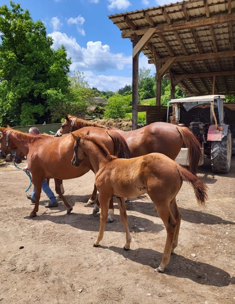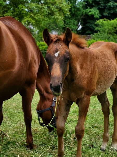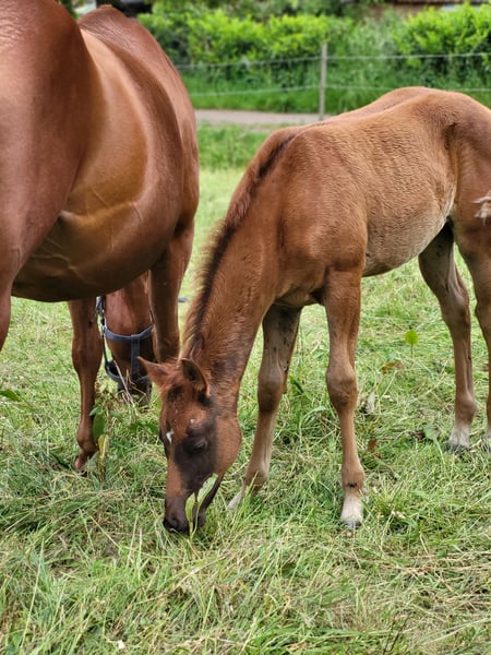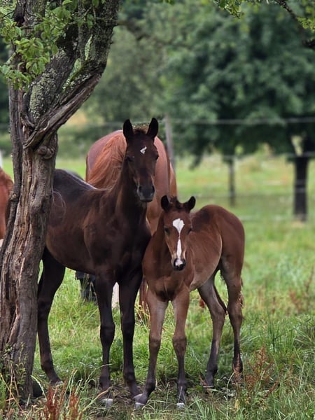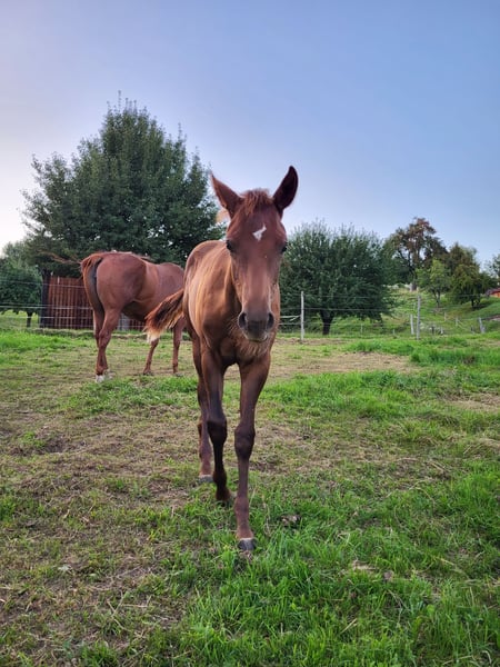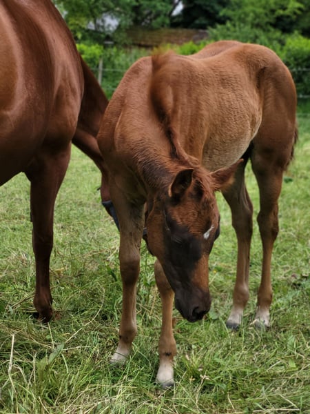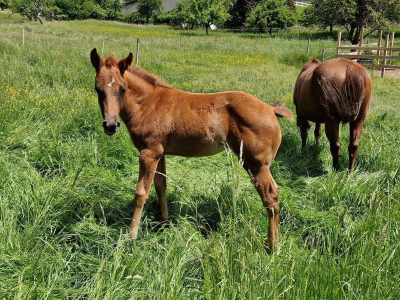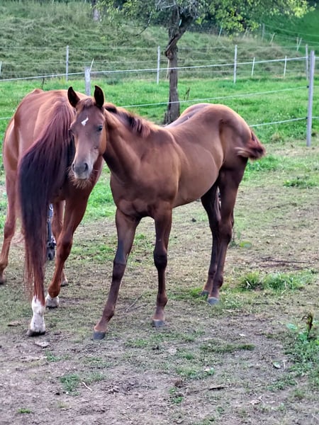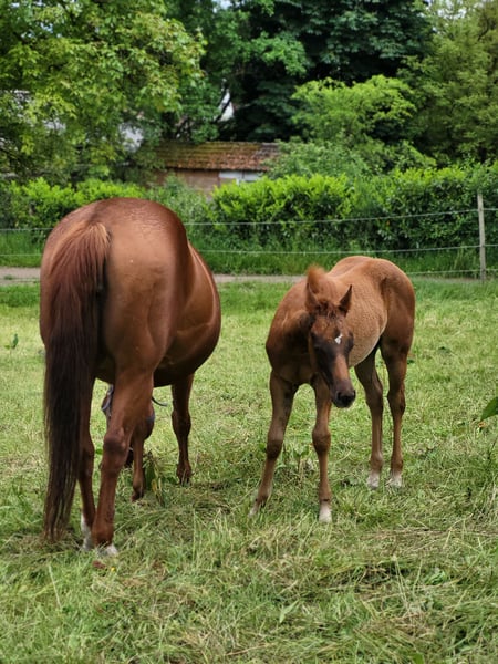 For our "CHLOE" (U R My Dancingqueen), we are also looking for a 5-star home. The beautiful Quarter Horse filly (born March 2025) has seen the light of day here with us. Her parents are also on our farm: Mother: Dancing in the Moonlite Father: Zippos King Bar Chloe is a stunning filly. Her coat color is hard to describe: a dark chestnut with a slight copper tint in the sun, which makes her coat shine. Her small white blaze gives her a very special distinguishing feature and adds a certain something to her appearance. She has a great conformation and her potential is already unmistakable. Her curious and lively nature makes it impossible not to fall in love with her. She will be suitable for both competitions and leisure activities. So, anyone looking for something truly special will not be disappointed by Chloe! Chloe has an equine passport from the DQHA, is enrolled in DQHA Infurity, and has the American papers (certificate of registration) from the AQHA. She is currently still with her mother in our open stable/on the pasture. She can either stay here for further rearing or move to her new home as soon as she is ready to be without her mother. If you would like to get to know Chloe or have any further questions, please feel free to contact us.
