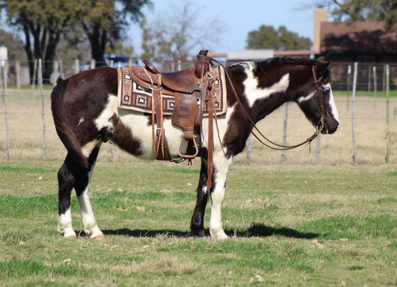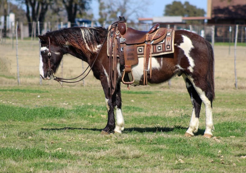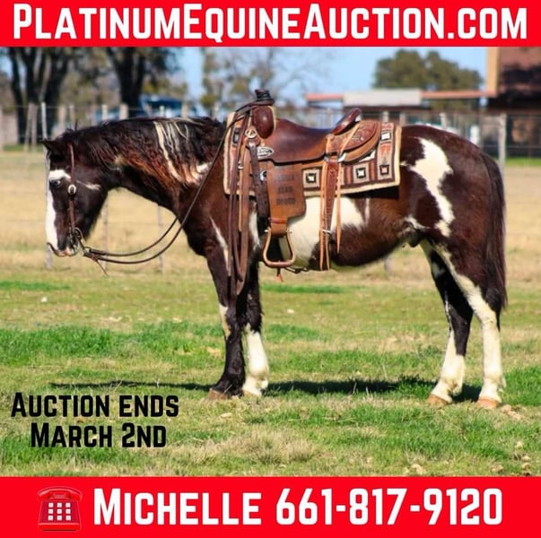 ONLINE AUCTION Place your bids at www.PlatinumEquineAuction.com Starting Bid $3500 Auction ends March 2nd, 2025 Need a new saddle? Check out White Rock Saddles on our website or Facebook! Let me introduce you to the flashiest little paint horse around – meet Boogie! At 9 years old and standing at a perfect 13.2 hands tall, Boogie is not just any horse; he’s a stunning showstopper with his wild markings and mesmerizing blue eyes. Whether you’re an advanced beginner kid or an adult looking for some fun but love a smaller horse he’s the one for you. Boogie is big enough for everyone to enjoy! This versatile guy has dabbled in everything from English to Western riding. He walks, trots, and lopes in circles in the arena . Recently, he spent some time at an English barn where he learned to jump, and let me tell you, he’s a super cute little jumper! Boogie has also been a trusty partner in moving cattle around the farm and has proven to be a reliable trail horse. On the trails, he’s slow and steady, eager to go wherever you point him, whether riding alone or with friends. He’s completely unfazed when separated from other horses, and he loves to explore all kinds of terrain—from rocky paths to wooded areas. Wildlife? No problem! Boogie has been on numerous camping trips and is used to the sights and sounds of hikers and campers. He confidently crosses downed logs, navigates through brush, and splashes through water. Don’t let his size fool you; he has the heart of a champion and believes he can tackle the biggest and roughest trails just like the big guys! Boogie loves a good adventure, whether it’s heading out on the trails or participating in local playdays for a little extra fun. He may not be a speed demon, but he sure enjoys the ride! With his sweet nature and easygoing personality, Boogie is currently stalled in the barn and respectful to his neighbors even when there not the nicest to him. He loves being pampered with lots of grooming time and getting his blankets every night. Hes an easy keeper and requires nothing extra. He just got a fresh set of shoes and is ready for some fun adventures. If you need help with transport don’t hesitate to ask we have a list of reputable haulers that can get him safely to your doorstep WORLD WIDE including, Alaska , Mexico, Hawaii and Canada. Located in Stephenville, TX. Contact M $ Performance Horses Michelle 661-817-9120. ONLINE AUCTION Place your bids at www.PlatinumEquineAuction.com Starting Bid $3500 Auction ends March 2nd, 2025 Need a new saddle? Check out White Rock Saddles on our website or Facebook!
