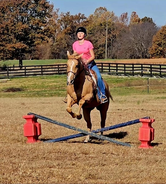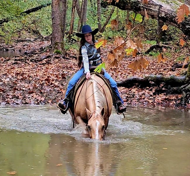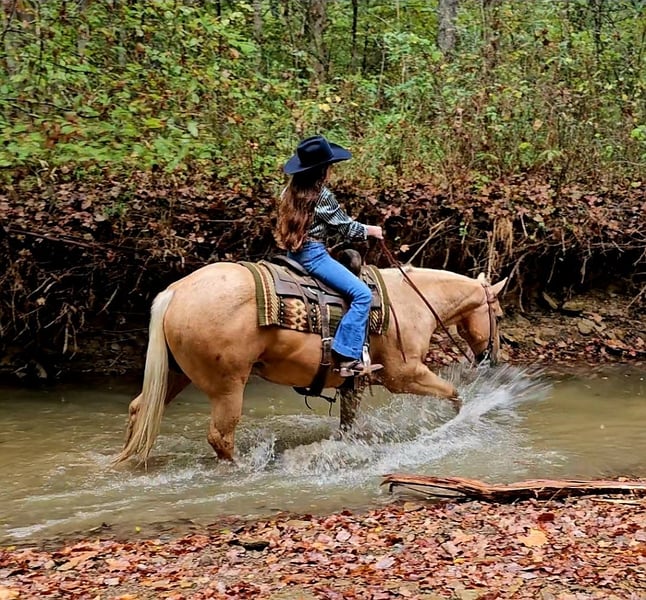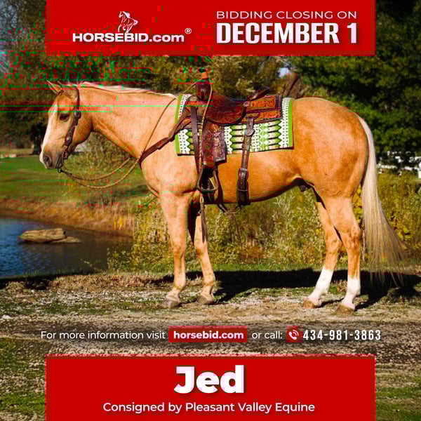 ⚜️ 𝓽𝓱𝓮 𝐇𝐨𝐫𝐬𝐞𝐦𝐚𝐧'𝐬 𝓢𝓱𝓸𝔀𝓬𝓪𝓼𝓮⚜️ Happening now thru MONDAY | DECEMBER 1st - Available EXCLUSIVELY on HorseBid's website! For more details and to register visit: www.Horsebid.com CONSIGNOR CONTACT: Pleasant Valley Equine 434-981-3863 LOCATION: Robards, KY BREED: Quarter Horse REGISTERED: Yes REGISTERED NAME: Jed COLOR: Palomino HEIGHT: 15 AGE: 10 GENDER: Gelding I'm thrilled to offer this sweet & kind gelding for sale. I hope he will fill your life with as much joy as he has done for me & my family this summer. If you're looking for more than a riding companion, but a best friend, Jed's your guy. He is always excited to see me when I go to catch him & walks right up to me, even if we rode 10-20 miles the day before. Every time I've thrown a leg over Jed, I knew he was going to take care of me & my son (4 year old). Absolutely no spook or meanness about him.Jed is one of the best trail horses I personally have had the privilege to ride. He is a great lead horse. Jed will be confident, brave and set a good pace. If there was ever a horse I would trust to go off on a long ride completely by myself, I would choose Jed. He is sure-footed and has experience with tons of wildlife with no issues. He handles the small deer paths with ease and will walk and take his time stepping over down trees. No ravine or ditch is too steep, and he absolutely loves to swim. The kids will have a blast in the summer taking turns cannonballing off him into a pond. He is the true definition of a family horse. Jed is big boned and big bodied, standing 15 hands and weighing close to 1250 lbs. He could definitely pack a beginner husband with ease. Jed has been trained to sidepass over to a mounting block, tables, or a log to pick up his rider. He is great for the farrier, standing for saddling, trailering, bathing, and pretty much anything you would wish to do with him. Jed is always willing and wanting to be with you and make you happy. Jed is no stranger to the arena, either. I have a huge lesson program, and I used Jed for lessons, packing kids as young as 6. He was always forgiving. He handled the young ones bouncing and pulling, and he was always great for the bareback lessons, too. You will hunt this world over to find a horse this dependable and safe. But what really makes Jed special is his love for his person. Don't miss your chance to feel the connection and have more than just a riding partner but a best friend. Call today! We'd love to take you for a ride on Jed so you can meet his soothing and relaxing energy. 434-981-3863