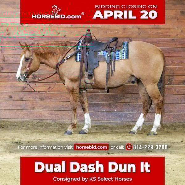 ⚜️𝐭𝐡𝐞 𝓔𝓵𝓲𝓽𝓮 𝐒𝐩𝐫𝐢𝐧𝐠 𝐂𝐥𝐚𝐬𝐬𝐢𝐜⚜️ Happening now thru MONDAY | APRIL 20th - Available EXCLUSIVELY on HorseBid's website! For more details and to register visit: www.Horsebid.com CONSIGNOR CONTACT: KS Select Horses 814-229-3290 LOCATION: Clarion, PA BREED: QH REGISTERED: Yes REGISTERED NAME: Dual Dash Dun It COLOR: Red Dun HEIGHT: 15 AGE: 10 GENDER: Gelding Dual Dash Dunn It is a Registered Quarter Horse Red Dun Gelding. Standing 15 hands tall and built like a old foundation quarter horse very stocky! Wow Check Him Out! He is sure to be a Highlight in anybody's barn. He has great blood lines and goes back to Hollywood Dunnit and Dual Pep on his papers. He is the whole package. He is super good looking, super safe to ride, well trained, prime aged, good blood lines and rides the very best. Whoever is the winning bidder with absolutely love him. Dual Dash Dunn It is a great family trail horse. Has been trail ridden all over and goes thru the mud , over the logs and rides in the creeks and water. Seasoned been there done that trail horse. He is beginner friendly and kid friendly. Super Gentle, Safe, and Quiet to Ride. Great one hand neck rein, Super nice smooth lope and side pass and good stop and backup. Very Well Trained but also Very Easy To Ride! He can do any job you ask him to on the ranch and is very good when it comes to working with cattle. Wether you want a horse to go out and do a job on or show or just a safe family horse Dual Dash Dunn It can go in any direction! He just recently on April 6th passed a lameness exam from North Fork Veterinary Clinic. Dont miss out on this opportunity to own such a Great Horse. We can help arrange delivery anywhere in the United States. Feel Free To Call or Text Kris at 814-229-3290. Thank You and God Bless