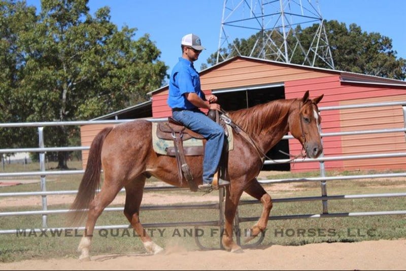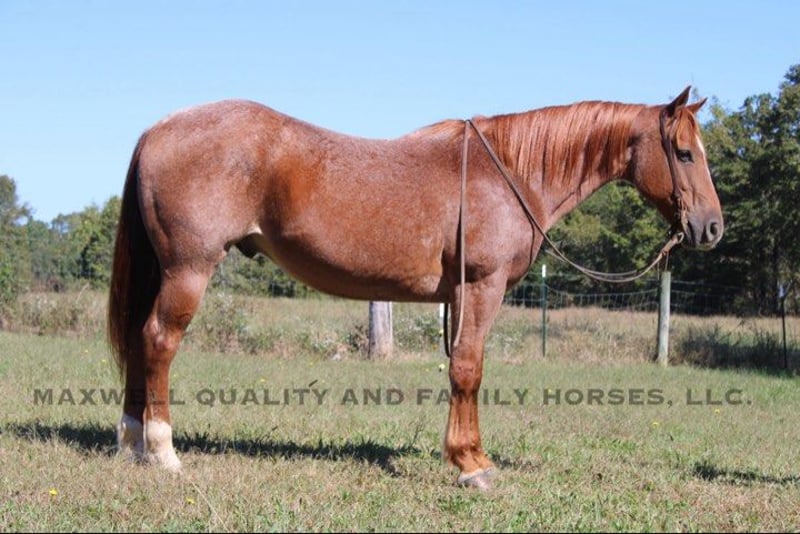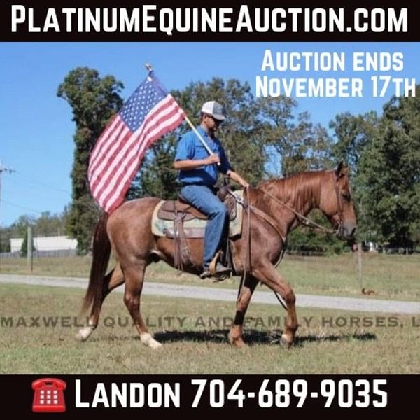 ONLINE AUCTION Place your bids at www.PlatinumEquineAuction.com Starting Bid $3500 Auction ends November 17th, 2024 Need a new saddle? Check out White Rock Saddles on our website or Facebook! Clyde is a 8 year old, grade quarter horse, Red Roan gelding that stands 15h. Clyde is as gentle as a puppy dog and will follow you around the pasture. A good all around horse, he will cross it all with a level head and easy going attitude. Clyde will walk, trot, canter in the pen or outside and would make a great prospect for any skill set. He has been used on ranches and joy rides and settles in any environment. Clyde rides one handed, side passes, loads, and stands well for the farrier like one should. Here is a gentle, good minded gelding anyone can enjoy. 100% Sound and sane! Located in Cherryville NC can set up delivery anywhere in the US if needed. Call Maxwell Family Horses Landon 704-689-9035 or Text for more info. ONLINE AUCTION Place your bids at www.PlatinumEquineAuction.com Starting Bid $3500 Auction ends November 17th, 2024 Need a new saddle? Check out White Rock Saddles on our website or Facebook!