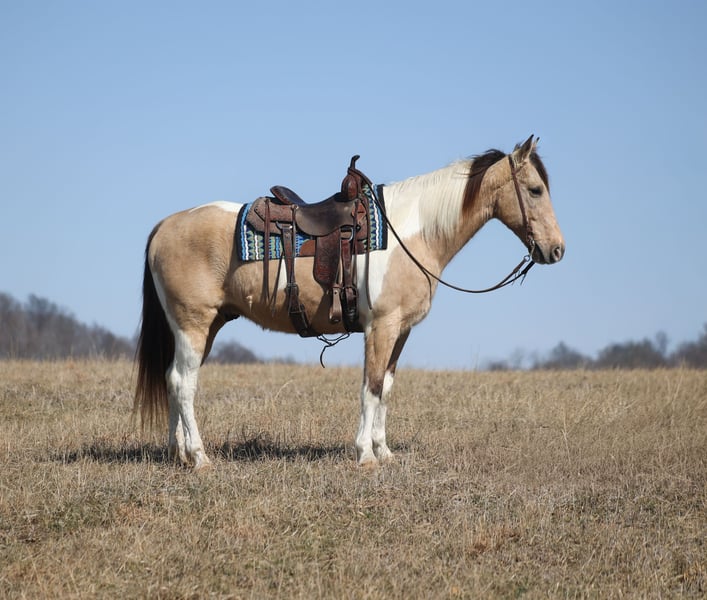 ONLINE AUCTION Place your bids at www.PlatinumEquineAuction.com Starting Bid $3500 Auction ends March 15th, 2026 Need a new saddle? Check out White Rock Saddles on our website or Facebook If you want color, class, experience and a nice ride… James is your guy! James is a super cool, buckskin tobiano, Draft Cross gelding that is standing around 15.3hh and he is very well built. He is 10 years old and he has all the good looks, and with miles of experience to go along with it! James has been trail ridden throughout Kentucky, Tennessee and Virginia and he knows all about traveling and trails. He will cross creeks, ditches, logs and navigate rough rocky areas. He moves around real nice and is content to plod along down the trails as well! He has been exposed to all kinds of wildlife such as deer or turkey and will go anywhere that he is asked too. He will go up or down even the steepest slopes, across deep creeks, over downed trees, and over all types of rough terrain while still being sure footed. James has been ridden down the highways and is traffic safe. He is not cinchy, cold backed, does not crib or weave. If you want flashy, substance and safe… James is a great choice! Feel free to call Korey Patrick 606-310-2428 with any questions. Located in Brodhead, KY ONLINE AUCTION Place your bids at www.PlatinumEquineAuction.com Starting Bid $3500 Auction ends March 15th, 2026 Need a new saddle? Check out White Rock Saddles on our website or Facebook