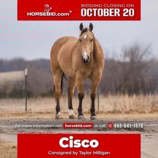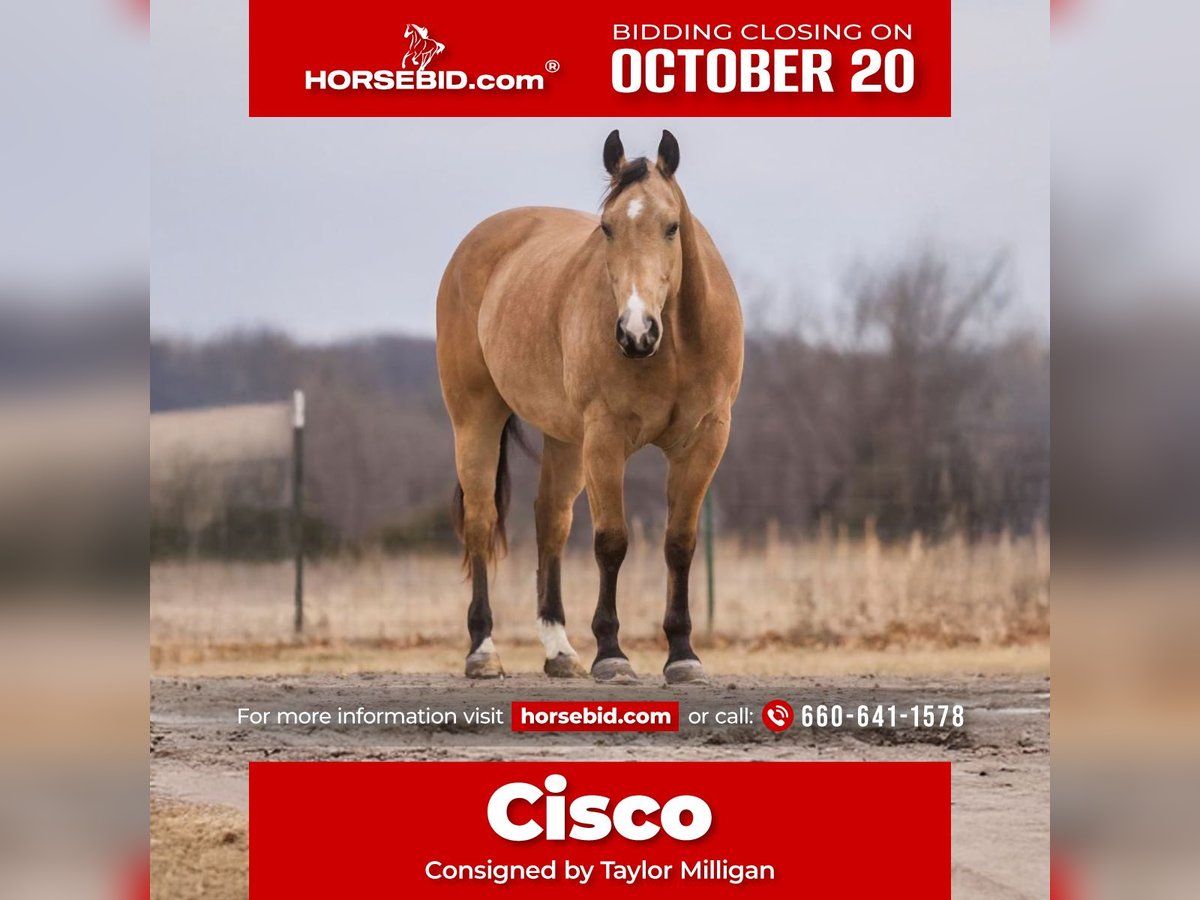 ♦️ 𝐭𝐡𝐞 𝐀𝐌𝐄𝐑𝐈𝐂𝐀𝐍 𝓕𝓪𝓵𝓵 𝓒𝓵𝓪𝓼𝓼𝓲𝓬 ♦️ Happening now thru MONDAY | OCTOBER 20th - Available EXCLUSIVELY on HorseBid's website! For more details and to register visit: www.Horsebid.com CONSIGNOR CONTACT: Taylor Milligan 660-641-1578 LOCATION: Bogard, MO BREED: Quarter Horse REGISTERED: Yes REGISTERED NAME: JZ Zans Zorro Gus COLOR: Buckskin HEIGHT: 15.2 AGE: 9 GENDER: Gelding Cisco is a stunning buckskin gelding that offers a unique blend of versatility, temperment and skill that makes him stand out as an equine partner. As a gentle giant, Cisco is a joy to ride in and out of the arena. He has had training as a head horse (could use a refresher before competing on him) and was lightly started on barrels. This horse loves to work and wants a job, whatever you need him for, he can get the job done. Cisco is very low maintenance and does well in a stall or turned out in a pasture. He has a history of being used as a lesson horse, showcasing his patient and accommodating nature making him excellent for various levels of riders. He moves off leg pressure and neck reins effortlessly ensuring a smooth and responsive ride everytime. Cisco is traffic safe, will cross water, bridges, you name it, he can do it. He trailers and hauls with ease making trips with him a breeze. Cisco gets along well with other horses and mules with no fuss. Cisco is an easy keeper, he had new shoes put on October 1st. Truly this horse is amazing in so many aspects and he is going to make someone an awesome all around partner.