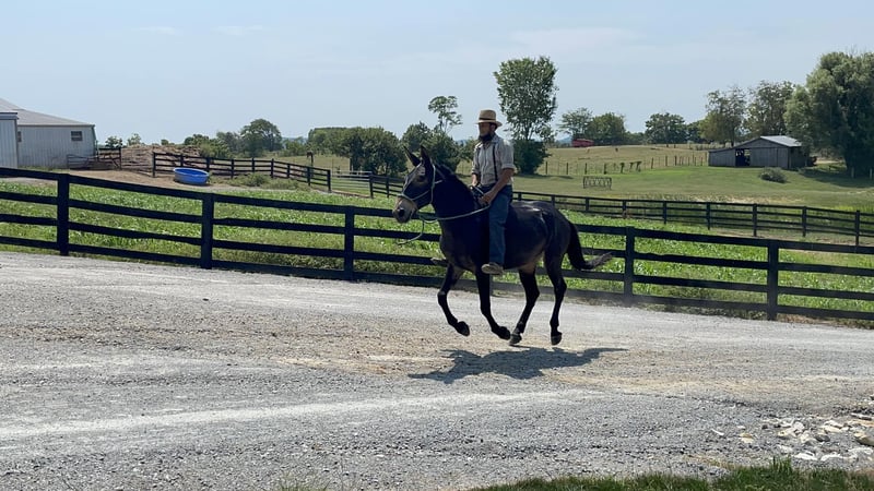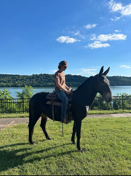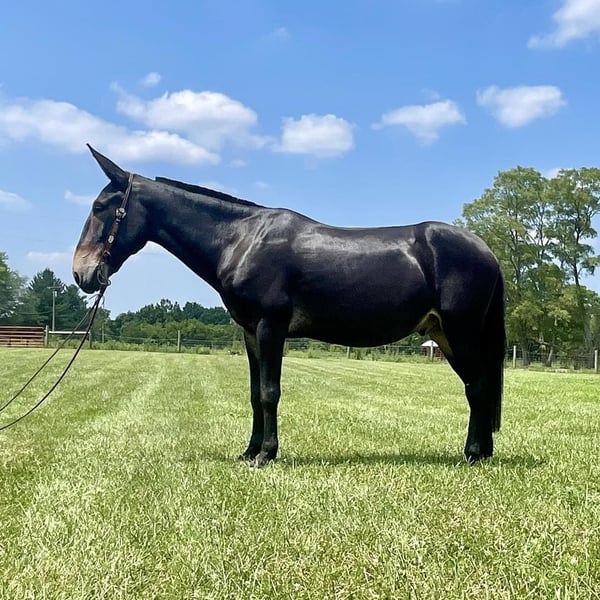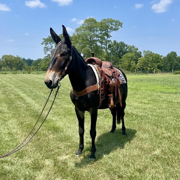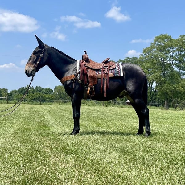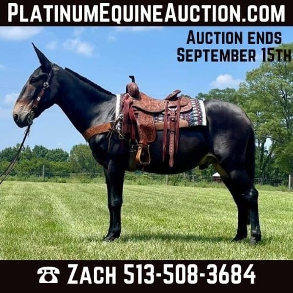 ONLINE AUCTION Place your bids at www.PlatinumEquineAuction.com Starting Bid $3500 Auction ends September 15th, 2024 Need a new saddle? Check out White Rock Saddles on our website or Facebook! Laredo is a handsome 8-year-old black John mule standing 15.2 hands tall. This mule came to us from one of the most popular trainers in our area and he is known far and wide for his skills in raising and training mules. Laredo was one of his personal mules that he had kept for quite some time, and his whole family, young and old, enjoyed the mule until the time came when they were forced to reduce numbers, which gave us the privilege to be able to offer him for sale to the public and much like the family before us our whole family and even friends have loved having him around, he has been loved by everyone who has ever been coming here and got Acquainted with him, even our vet fell in love with him when they came to do his inspection. Laredo is just that kind of mule, though; he is so kind and willing to please. A few times, I have turned him out in the round pen for play times and noticed one or both of my daughters out there with him, and he would follow them around the pen like a big oversized puppy ( minus the puppy bites). He truly is just a big, lovable guy. Now into his amazing training resume, for starters, he is very uncomplicated to ride, and he will ride just as slow and relaxed as you like or can neck rein, sliding stop, and get around as handy as you want. Laredo lopes circles and hits both leads with ease; as you’ll see from the video ( I know it’s long, but please take the time to watch), it doesn’t matter if he is in a bridle and under saddle, bareback, and a halter or with absolutely no tack riding completely off leg pressure he is going to operate the same, and I absolutely love that about him, you do not have to be a professional to enjoy him. He will ride just exactly how you ask him to. We have had him on the trails, along the road, and through the cattle countless times. Laredo also is a great driving mule, as you’ll see from the video we hitched him up to a family-size buggy and he handles great, he is traffic safe and he is just as easy ti drive as he is to drive, Laredo also has worked in the fields single and double pulling farm machinery. This mule is versatile, safe, sane, and sound! I don’t know where another one is; this complete as he is around. Take advantage of what I consider to be a rare opportunity to buy one like him to buy a mule of this caliber. For more ingo contact Brandenburg Stables Zach 513-508-3684 Located in Moscow, OH. ONLINE AUCTION Place your bids at www.PlatinumEquineAuction.com Starting Bid $3500 Auction ends September 15th, 2024 Need a new saddle? Check out White Rock Saddles on our website or Facebook!