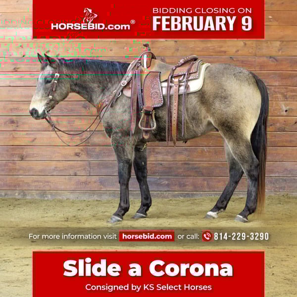 ❤️🔥𝑩𝒆 𝑴𝒊𝒏𝒆 𝐒𝐄𝐋𝐄𝐂𝐓❤️🔥 Happening now thru MONDAY | FEBRUARY 9th - Available EXCLUSIVELY on HorseBid's website! For more details and to register visit: www.Horsebid.com CONSIGNOR CONTACT: KS Select Horses 814-229-3290 LOCATION: Clarion, PA BREED: QH REGISTERED: Yes REGISTERED NAME: Slide a Corona COLOR: Buckskin HEIGHT: 15 AGE: 11 GENDER: Gelding Corona is a Registered American Quarter Horse Buckskin Gelding. Standing 15 hands tall and has a nice stocky built to him. Corona is a all around safe family horse that has been on many trail rides and is very sure footed in the rough terrain. Corona will go anywhere you ask him to go on the trail and never hesitate. He is very seasoned and reliable and dependable on the trail, arena and ranch. Not only does Corona ride great on the trail but he is also a very good arena horse and has a nice slow lope and hits his correct leads each way. Great Neck Rein , Good Stop and Side pass . He is very trained but also very easy and not complicated to ride at all. He should be suitable for all types of riders. My 8 Year Old Boy and 10 Year Old Daughter can ride him around all over by there self. He is that quiet and gentle! Corona is good when it comes to working with cattle and would excel as a ranch horse also. You wont find a better horse on the trail or arena. Corona will be the same horse every time you ride him. If you value your safety then be sure to check out Corona because he has always been safe with us in all aspects. Easy to bath, trailer and good for vet. Gets along with other horses in the pasture. Just a super nice all around registered gelding. Feel free to Call or Text Kris at 814-229-3290. We can help arrange delivery anywhere in the United States. Thank You and God Bless
