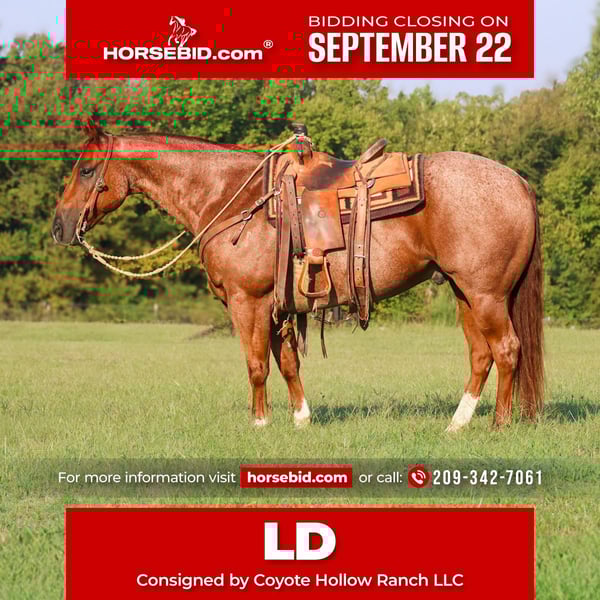 🍁𝒕𝒉𝒆 𝐅𝐀𝐋𝐋 𝑺𝒑𝒆𝒄𝒕𝒂𝒄𝒖𝒍𝒂𝒓🍁 Happening now thru MONDAY | SEPTEMBER 22nd - Available EXCLUSIVELY on HorseBid's website! For more details and to register visit: www.Horsebid.com CONSIGNOR CONTACT: Coyote Hollow Ranch LLC 209-342-7061 LOCATION: Mount Vernon TX BREED: Quarter horse REGISTERED: Yes REGISTERED NAME: BNH SMART LIL DEVIL COLOR: Red roan HEIGHT: 15 AGE: 10 GENDER: Gelding LD is the complete package—an all-around gelding who excels inside the arena, outside on the ranch, and everywhere in between. As a switch-end rope horse, he has all the tools you could ask for: plenty of run, rate, and a flawless move in the corner. He’s rock solid in the box with zero issues, pulls strong to the horn, and is true and easy on the heel side, consistently finding the corner. Suitable up through the 13’s, LD has the ability and experience to match a wide range of ropers. When he’s not in the arena, LD is just as reliable outside. He’s used weekly for doctoring sick cattle and shines during branding season dragging calves. On the weekends, he’s a blast on the trails—steady, sure-footed, and enjoyable to ride. He’s also been schooled in local ranch riding classes and competed in sorting and pennings, proving just how versatile he really is. Beyond his talent, LD is safe for everyone and carries himself with style. He knows his lead departures, turnarounds, stays soft and backed off the bridle reins, and offers a smooth, enjoyable canter with easy transitions. Gentle and forgiving, he’s the kind you can always trust to give you a good ride. LD is good to bathe, load, tie all day, and gets along well with other horses. With his friendly personality, pampered lifestyle, and not a hair out of place, LD is as classy as he is capable.