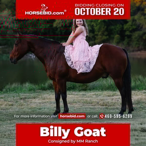 ♦️ 𝐭𝐡𝐞 𝐀𝐌𝐄𝐑𝐈𝐂𝐀𝐍 𝓕𝓪𝓵𝓵 𝓒𝓵𝓪𝓼𝓼𝓲𝓬 ♦️ Happening now thru MONDAY | OCTOBER 20th - Available EXCLUSIVELY on HorseBid's website! For more details and to register visit: www.Horsebid.com CONSIGNOR CONTACT: MM Ranch 469-595-6289 LOCATION: Forney, TX BREED: Quarter Horse REGISTERED: No COLOR: Bay HEIGHT: 13.3 AGE: 11 GENDER: Gelding 🐐🐐Billy Goat as we affectionately call him is a 11 yr old short but stout little versatile ranch horse!! He gets his name from being like a goat!! He will go anywhere (up the side of mountain), he can eat anything and survive 😂(weeds, bad hay), he is just as tough as a Billy goat!! 🐐🐐 He stands a whopping 13.3 hands tall. So if you are wanting one closer to the ground he would be perfect. He can easily carry any size adult but yet perfect size for a child too. He is stout and thick made. 👉🏼👉🏼 Billy is the coolest punchiest little horse around! He is worth his weight in gold! He was born and raised on a ranch in Montana. A 84 yr old rode man broke and trained him. He rode him daily on ranch doing anything and everything off him. Checking fences, sorting cows, checking the mail, riding on the trails, using him to pack during hunting season, riding him on hunting trips, roping and doctoring calves, helping break colts, etc.. 💃🏻💃🏻He is a fancy broke little guy with all the bells and whistles. He rides like a cutting horse. He will spin circles, cut a cow, run to a cow out in the pasture. He would make a perfect breakaway horse or to be shown in amateur cutting classes. Yes he has that fancy of a handle. He can one step short lope off. Really slide to a stop. Everything you would expect in a tried and true ranch horse (he is just in a smaller package). 📦 He has absolutely no bad habits. Super easy keeper. 🌎🌎 We can help arrange shipping if needed. All paperwork will be included with him. He is up to date on all shots and had his feet done. He is ready to go to his new home.