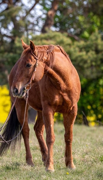 Quarter Horse, Gelding - 12 years old (born 2014) - Chestnut - Excellent basic Western training (cutting bloodlines) - Very gentle, calm, willing to work, and reliable - Diagnosed with ringbone and osteoarthritis in the front legs since 2021 Cutter has been ridden for leisure in Western style, both in arena and trail riding, since 2021. His solid basic training and willingness to work make both disciplines very enjoyable for him. He is also familiar with being led as a ground partner in the terrain. He knows trailering and loading well, entering without issues, and is very uncomplicated and cool in unfamiliar environments, reflecting his entire character. He is also friendly and calm around children. Due to his medical findings, he usually does not move perfectly straight at walk. He moves well in trot and canter. Regular, consistent exercise benefits him, but cutting is definitely no longer suitable for him. He has been barefoot for a long time; since his diagnosis, he has been shod with front shoes until summer 2025. Since summer 2025, he has been gradually transitioned back to barefoot, and he is adjusting well over time. In the terrain, he needs hoof boots front and back and prefers softer footing. I am looking for a wonderful pasture-based stallion placement for Cutter, where he can have a purpose beyond sport, in accordance with his health issues, and where his lovely character is appreciated. He is a horse that enjoys being active and participates happily in riding and groundwork. Price excludes accessories. These can be included at an additional cost (Western saddle, hoof boots, blankets, etc.).