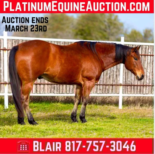 ONLINE AUCTION Place your bids at www.PlatinumEquineAuction.com Starting Bid $3500 Auction ends March 23rd, 2025 Need a new saddle? Check out White Rock Saddles on our website or Facebook! Lewis is the ultimate big bay gelding that everyone is searching for! Standing 15.3H tall and only 11 years old, he’s the perfect make and model for riders of all levels. Originally started as a ranch horse, Lewis has spent the past several years as a trusted trail and pleasure horse for the same family. He’s the ideal fit for anyone looking for a family safe, reliable mount that every member can enjoy. He is incredibly easy to ride, with a smooth handle, excellent neck rein, responsive movement off leg pressure, and a big stop. He has zero buck, bolt, or rear and is always eager to please. Lewis is not only fun to ride but also safe and suitable for all ages. He’s the kind of broke that keeps kids loving every minute in the saddle! With a sweet, affectionate personality, he gets along with everyone and enjoys attention. He loads, leads, bathes, and ties with ease. Whether you’re looking for a first horse, beginner horse, or lesson horse, Lewis checks every box. He’s exceptionally broke with plenty of buttons, making him a fun and enjoyable ride for an experienced rider as well. He could easily excel in playday events, sorting, or ranch versatility. This big, handsome gelding is built just the way everyone wants and is well trained, with an unbeatable temperament. Whether he’s raising up the next generation of riders or reigniting someone’s love for the ride, Lewis is ready for the job. Don’t miss out on this flashy, broke to death, and absolutely gorgeous gelding, safe enough for the babies and gentle enough for the grandmas! More pics and videos on his website page at northtexashorsecompany.com/lewis. Please call Blair with North Texas Horse Company for more info at 817-757-3046. We are located in Weatherford, TX and can help arrange affordable shipping to anyone!! ONLINE AUCTION Place your bids at www.PlatinumEquineAuction.com Starting Bid $3500 Auction ends March 23rd, 2025 Need a new saddle? Check out White Rock Saddles on our website or Facebook!