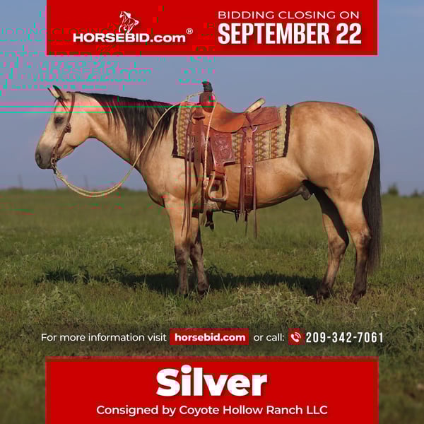 🍁𝒕𝒉𝒆 𝐅𝐀𝐋𝐋 𝑺𝒑𝒆𝒄𝒕𝒂𝒄𝒖𝒍𝒂𝒓🍁 Happening now thru MONDAY | SEPTEMBER 22nd - Available EXCLUSIVELY on HorseBid's website! For more details and to register visit: www.Horsebid.com CONSIGNOR CONTACT: Coyote Hollow Ranch LLC 209-342-7061 LOCATION: Mount Vernon TX BREED: Quarter Horse REGISTERED: Yes REGISTERED NAME: Rel Silver Pep COLOR: Buckskin HEIGHT: 14.2 AGE: 13 GENDER: Gelding Silver is the kind of horse every ranch and family needs. This beautiful buckskin gelding is a tried-and-true working ranch horse who knows his job and does it well. He’s been used extensively outside to doctor cattle, sort and pen, work gates, load trucks, and cover country with ease. Honest, handy, and reliable, Silver is the kind you can count on day in and day out. What makes Silver truly special is his gentle, steady disposition. He’s safe for anyone—whether you’re an experienced ranch hand or a kid just learning to ride. We’ve used him in our lesson program for riders of all ages and skill levels, from small children to adults, and he takes care of them every time. He stays gentle year-round and never needs to be ridden every day to stay that way. Silver has been hauled all over, making him solid and seasoned in new places and different environments. He hauls, ties, bathes, and saddles with no fuss. He loads easy, gets along well in both stalls and pastures, and fits in with other horses effortlessly. If you’re looking for a dependable, all-around gelding with the looks to match and the mind to make everyone love him, Silver is your guy.
