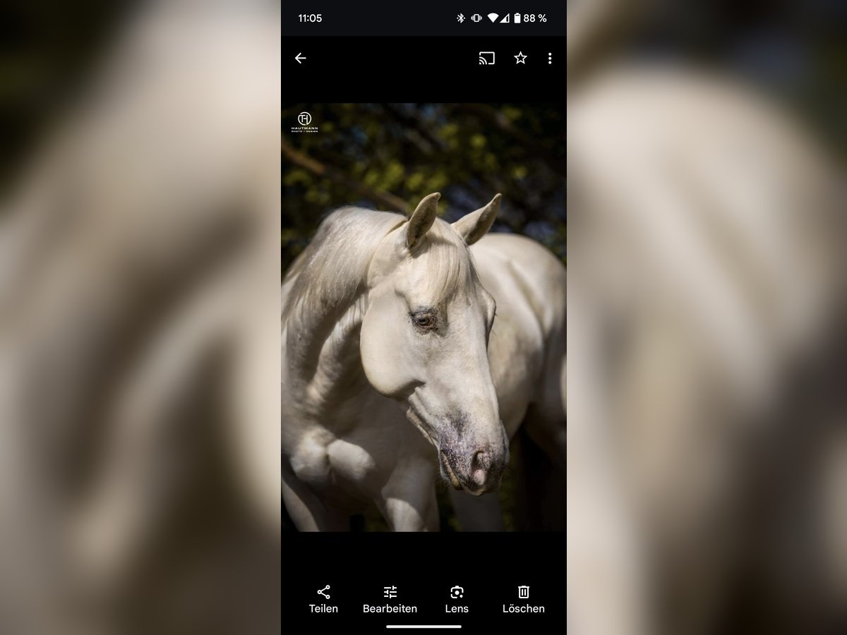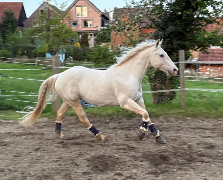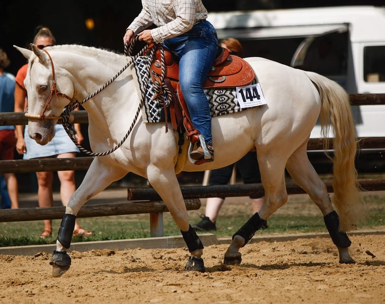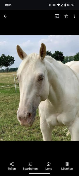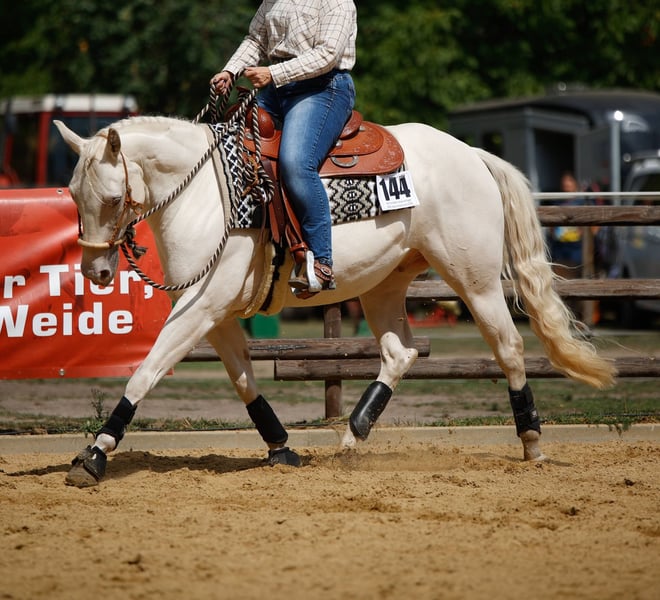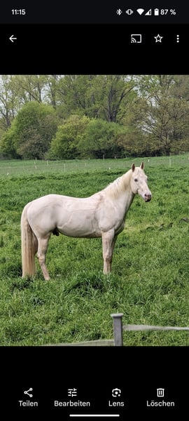 Beautiful and well-behaved Quarter Horse gelding in a special color: cream-champagne-dun. Due to the owner's health reasons, he is now looking for a loving new home. He is very gentle and willing, highly attentive to people, and always eager to please. He has successfully competed in several EWU events in LK 4, in disciplines such as Ranch Riding, Ranch Rail, Horsemanship, Pleasure, and Showmanship. Unfortunately, he has a respiratory condition, so he should ideally be kept in a dust-free open stall. We also want to mention that he has three sarcoids, which do not affect him at all. Due to the owner's illness, he is currently not in training and should be built up again. He enjoys training very much and gains muscle quickly, so this is no problem. He has been regularly vaccinated and dewormed, and is sound and easy to load and shoe. We are looking for a caring owner who can accommodate his condition and challenge him appropriately based on his physical capabilities. We are happy to answer any questions.