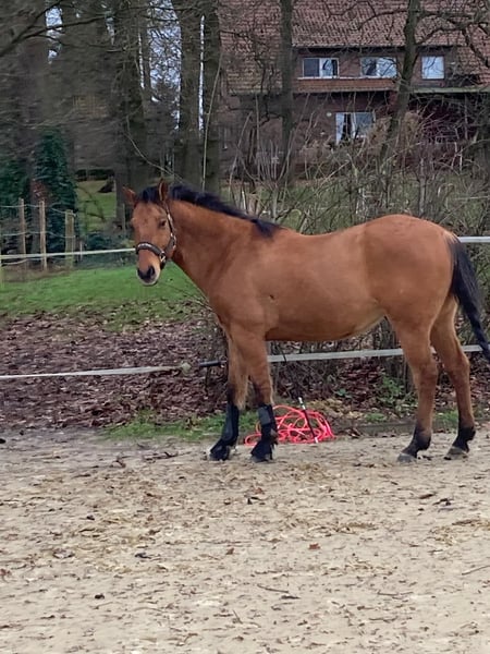 Taris Stepjac Dr No – a 2012-born Quarter Horse gelding standing approximately 150 cm (about 14.3 hh). He has a striking dun coloration and impresses with his compact, muscular build as well as a particularly human-oriented and sensitive character. Tari does not have a pedigree certificate but comes with a passport and has been tested genetically as 5-Panel n/n. He has experience riding Western, although he is not currently in training. At the moment, he is undergoing extensive groundwork, demonstrating a willing and attentive attitude. He feels comfortable in the terrain, riding confidently both alone and in groups. Tari is always well-behaved in handling, familiar with herd life in a mixed herd and also adaptable to box stall housing, though he prefers turnout in a herd environment. He is calm during veterinary and farrier visits, regularly dewormed, vaccinated, and annually checked by the equine dentist. Health-wise, Tari has a diagnosed hind limb laminitis (spat), with X-rays available. Therefore, he requires appropriate laminitis-friendly shoeing. Additionally, he is a kicker but copes well with this behavior. It is important to note that he is not suitable as a beginner or children's horse. Tari needs an experienced rider who works with him sensitively, challenging and encouraging him. He may occasionally buck in certain situations. Tari is only to be placed in loving, competent, and experienced hands – price is secondary to finding the right home. Providing him with a good, caring environment is of utmost priority.