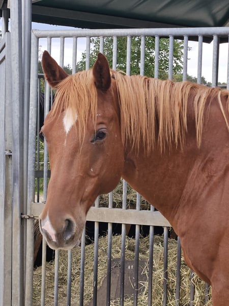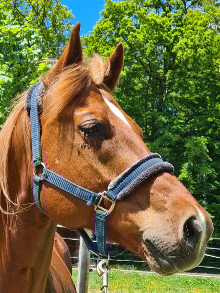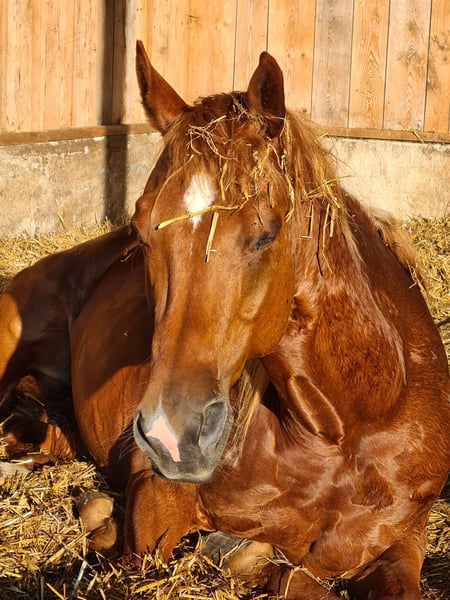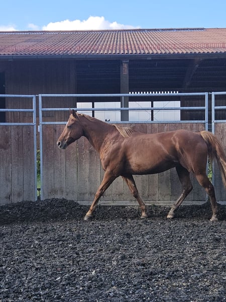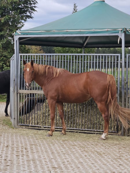 Shock Wave Rider, alias « Shocki », hongre Quarter Horse de 13 ans, mesurant 162 cm, recherche un nouveau propriétaire. Il est amical avec les humains et les autres animaux. Il connaît la vie en stabulation libre, que ce soit dans un troupeau de hongres pur ou dans un troupeau mixte. Il aime sortir en extérieur et se promène souvent seul avec un chien. Shocki apprécie l'attention de ses humains et cherche à établir un lien avec des personnes spécifiques. Lorsqu'il reçoit fiabilité et sécurité, il se sent parfaitement à l'aise et exprime son affection sans réserve. Il a besoin d'un exercice régulier et approprié. Shocki est actuellement vacciné régulièrement. Dans ses précédents écuries, il a été vermifugé de manière sélective et a toujours été exempt de vers lors des tests de selles, n'ayant donc eu besoin que d'un minimum de vermifuges. De temps en temps, une physiothérapeute est venue pour des traitements, et il est également suivi par un dentiste équin. Actuellement, il est ferré aux quatre membres, mais n'a aucun problème avec le mode de vie pieds nus ou les protections de sabots. Une personne expérimentée et engagée, qui souhaite surmonter avec lui les petites et grandes épreuves de la vie et profiter ensemble des heures ensoleillées ainsi que des nuages de pluie, serait idéale pour lui.