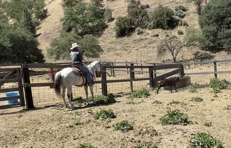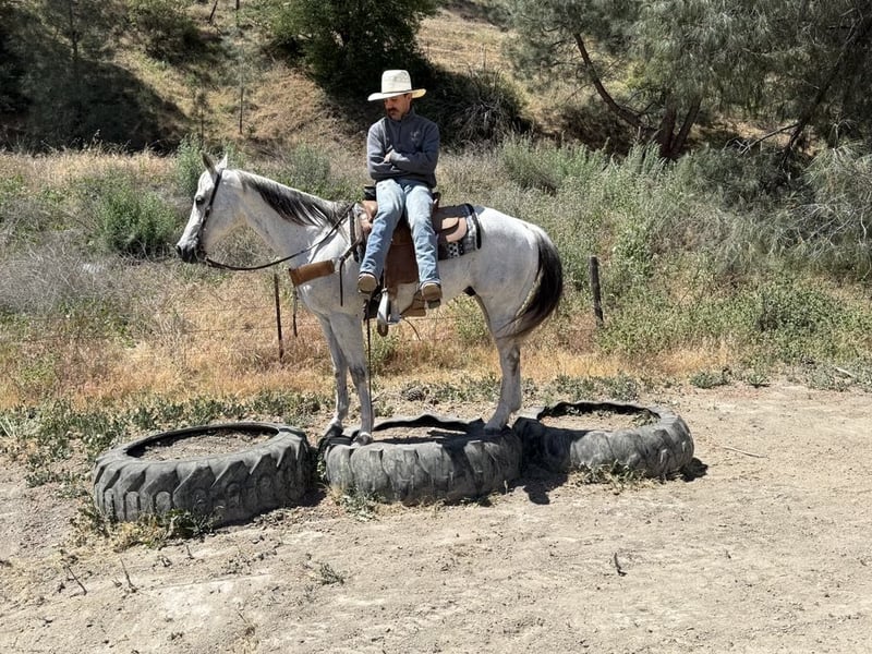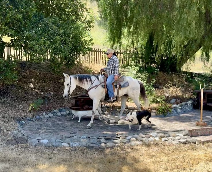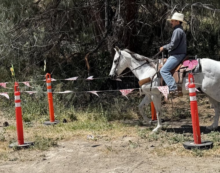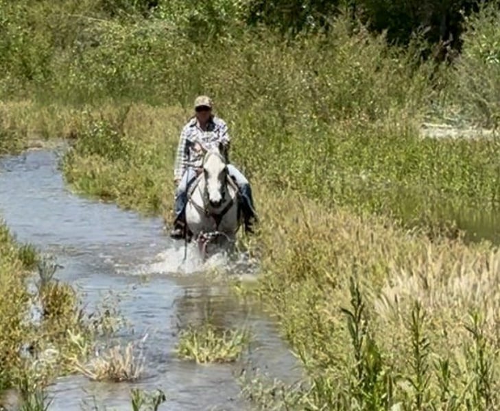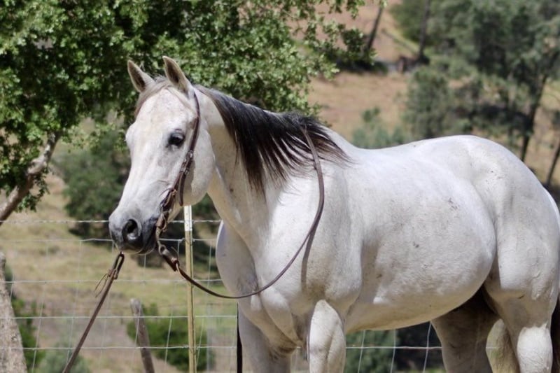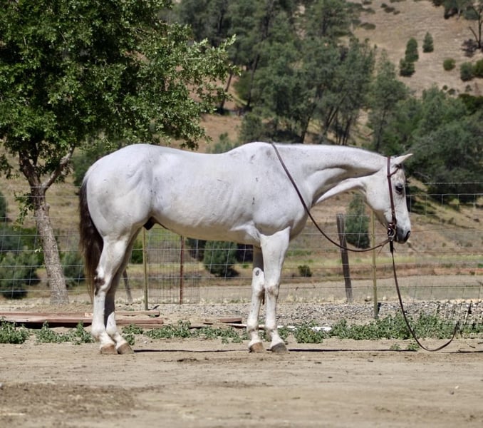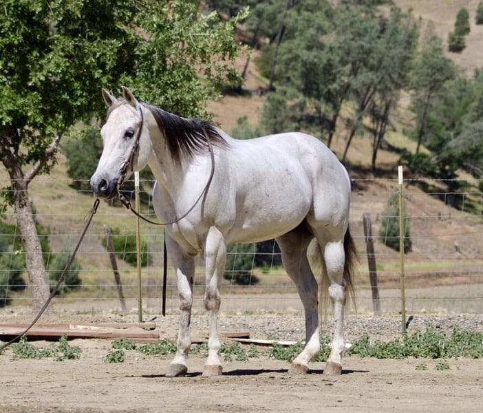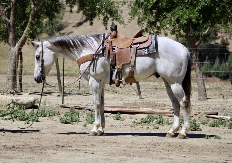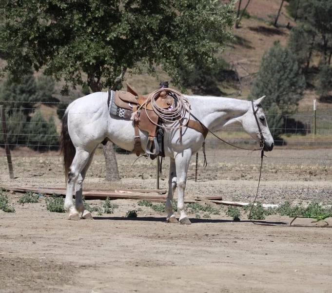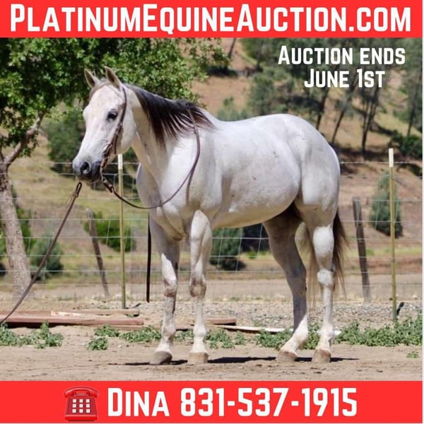 ONLINE AUCTION Place your bids at www.PlatinumEquineAuction.com Starting Bid $3500 Auction ends June 1st, 2025 Need a new saddle? Check out White Rock Saddles on our website or Facebook! Breeze is a horse that truly lives up to his name. Owning him is as easy and effortless as a gentle breeze. This magnificent 12-year-old gelding stands at a graceful 15 hands and boasts a stunning silver grey coat with a dark mane and tail. His peaceful and calm disposition makes him an ideal horse for anyone, regardless of their level of experience.If you’re looking for a low-maintenance horse that is a pleasure to be around, Breeze is your go-to boy. He is extremely beginner-friendly, making him the perfect choice for those who are just starting their equestrian journey. With Breeze by your side, you can enjoy the simple pleasures of riding without any worries or stress. One of Breeze’s greatest qualities is his unwavering composure in any situation. Whether you’re riding down a trail or navigating through brush, trees, or water, he remains calm and composed. Nothing seems to faze this remarkable horse – from flags and tarps to bouncy balls and tractors – he takes it all in stride. He enjoys playing around the obstacles and will go over bridges, tires and walk right through pool noodles with ease. Not only is Breeze unflappable in unfamiliar settings, but he also excels in the arena. He effortlessly lopes correct circles with a soft headset and responds immediately to the slightest touch of the reins. His training extends beyond basic riding skills as he has also been ranching; gathering, branding and sorting cattle with ease.But what makes Breeze even more special is his gentle nature around new riders or those with less experience. He has proven time and again to be the ultimate choice on trail rides riding solo, with friends or in the arena. You can trust him completely whether you’re standing on him or crawling under him – he will remain still like a statue. In addition to being an exceptional riding companion, Breeze also excels in other areas such as standing tied, being easy for the farrier, and tacking up without any issues. He is equally comfortable in a pasture setting or living in a stall. This adaptable horse is one that you won’t want to miss out on. If you’re interested in making Breeze a part of your life, don’t hesitate to contact Longhorn Ranch Dina at 831-537-1915. Located in Paicines, CA, we offer shipping options for those who are not local. ONLINE AUCTION Place your bids at www.PlatinumEquineAuction.com Starting Bid $3500 Auction ends June 1st, 2025 Need a new saddle? Check out White Rock Saddles on our website or Facebook!